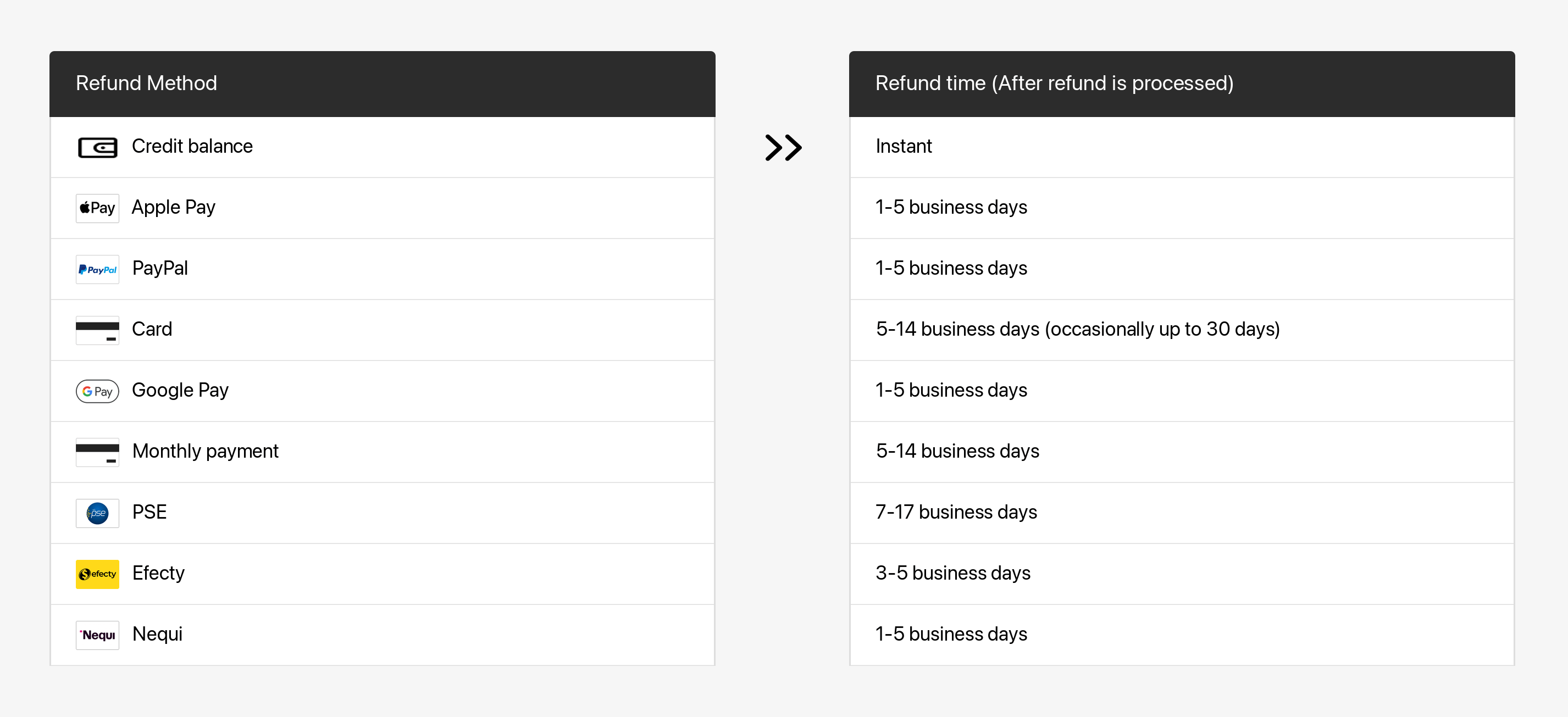 Once the refund is processed, your financial institution will need additional time to have it reflected in your account. Refer to the following table for more details.