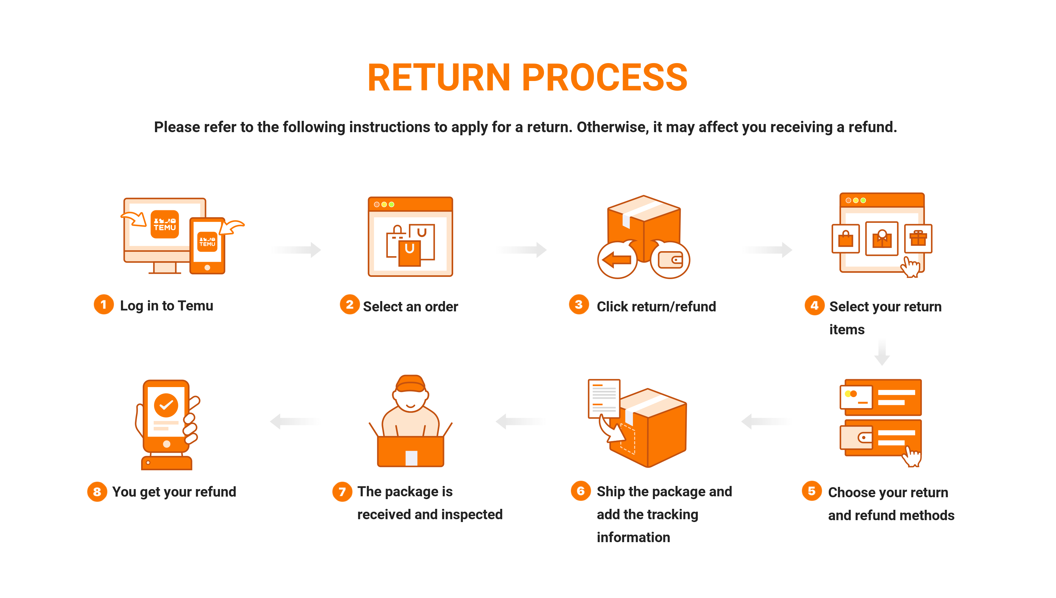 VI. You can check the refund status of your items on your order details page or through Temu's SMS/Email/Push notifications.