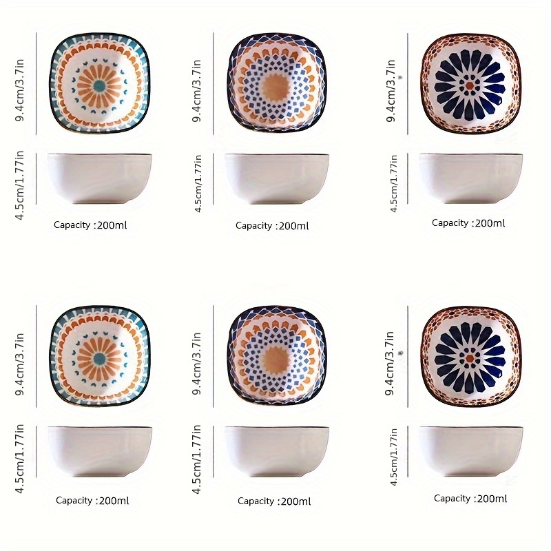 Set of Six Small Bowls in Bohemian Style, Each with a Capacity of 6.8Oz, Perfect for Serving Salads, Sushi, Fruits, Seasonings, And Appetizers. These Heat-Resistant Bowls Are Ideal for Use in Kitchens, Restaurants, And Sushi Bars