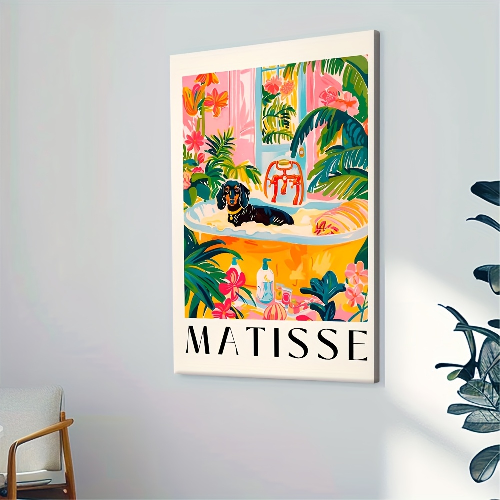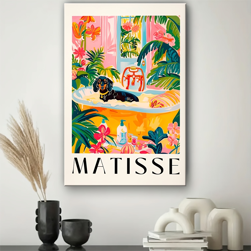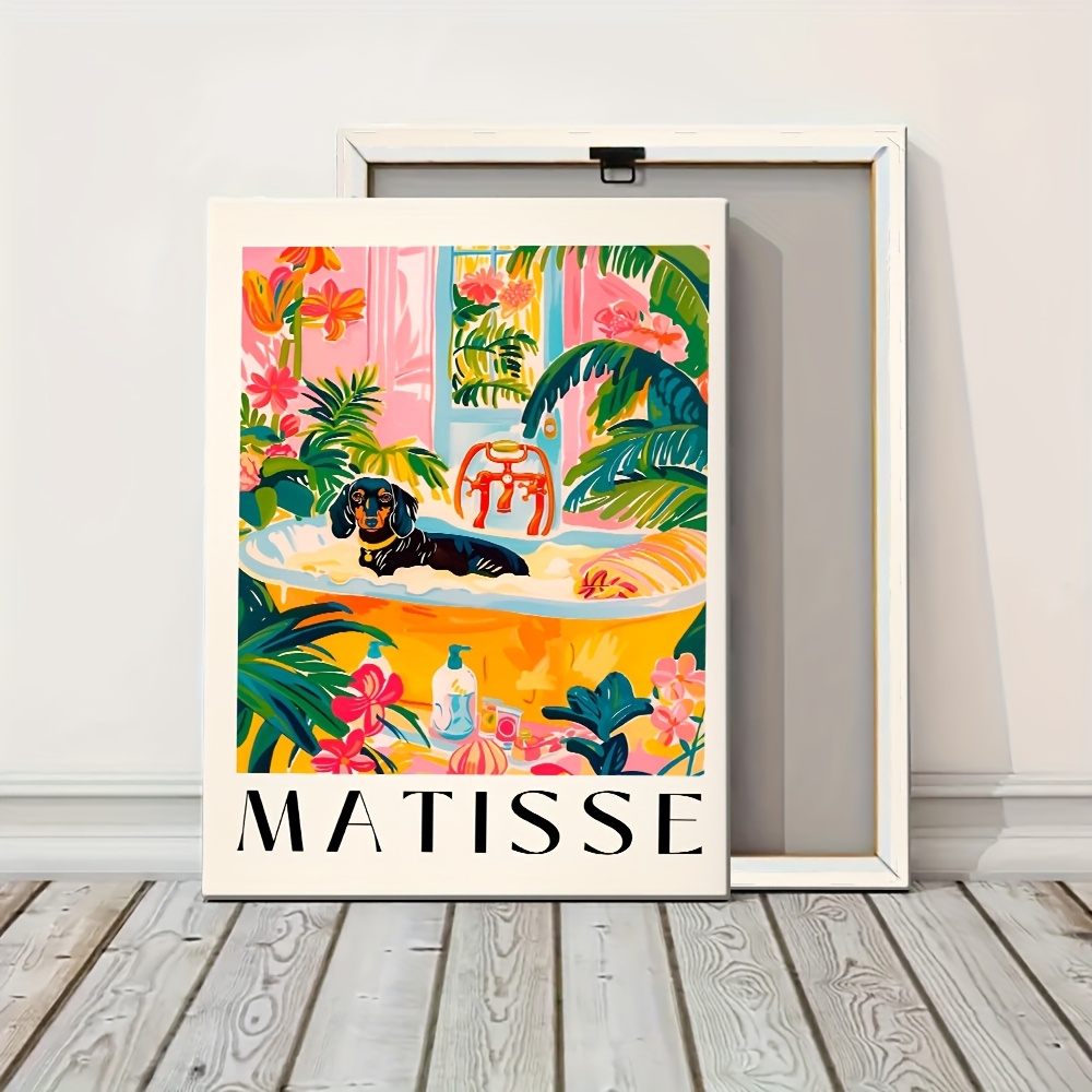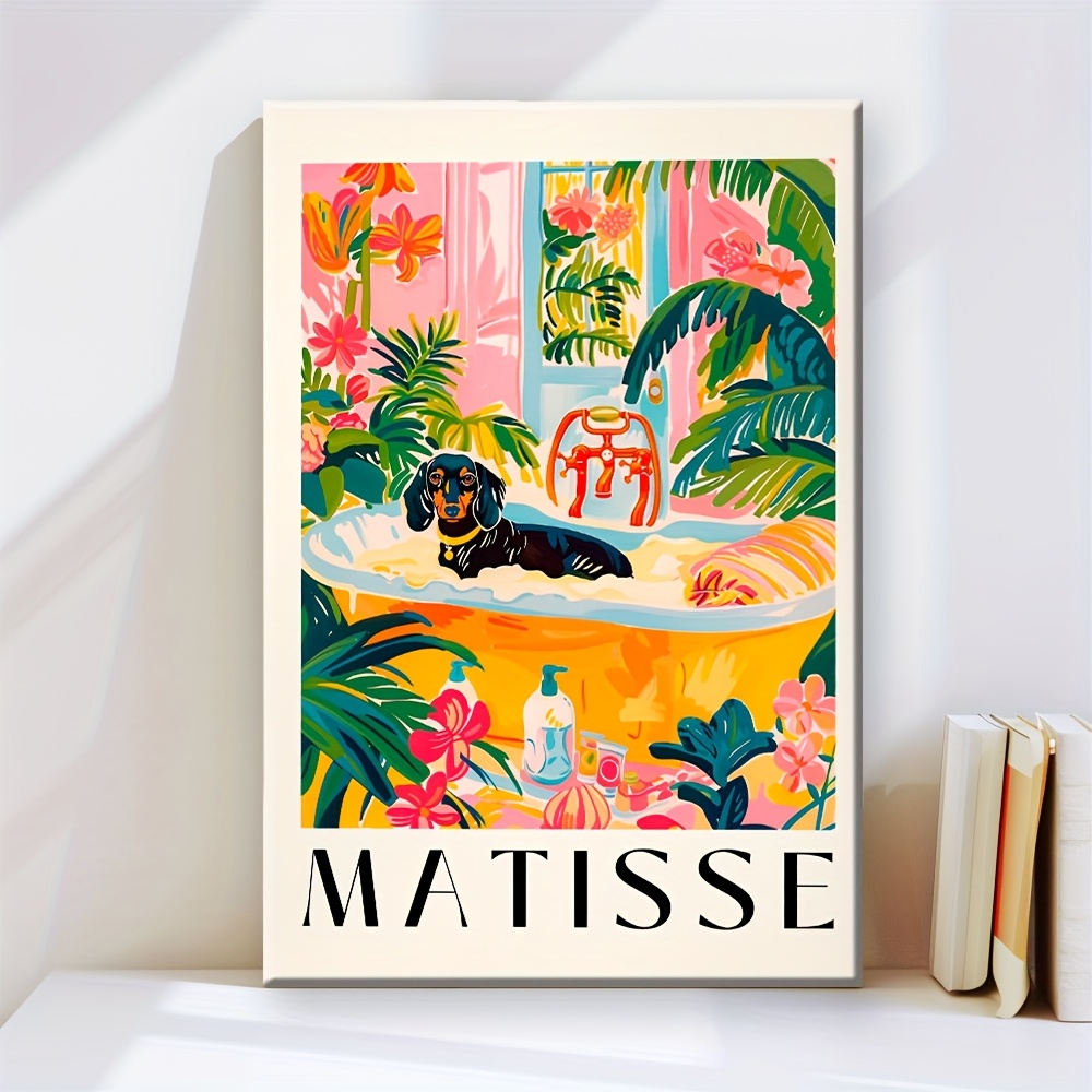 1pc Wooden Framed Canvas Painting Poster Black Dachshund In A Bathtub Funny Bathroom Mid Century Modern Dog Wall Art Matisse Print Dopamine Decor Pink Tropical Poster Valentine'S Day Gift For Room Decor Wall Art Decor Painting Can Be Directly Hung