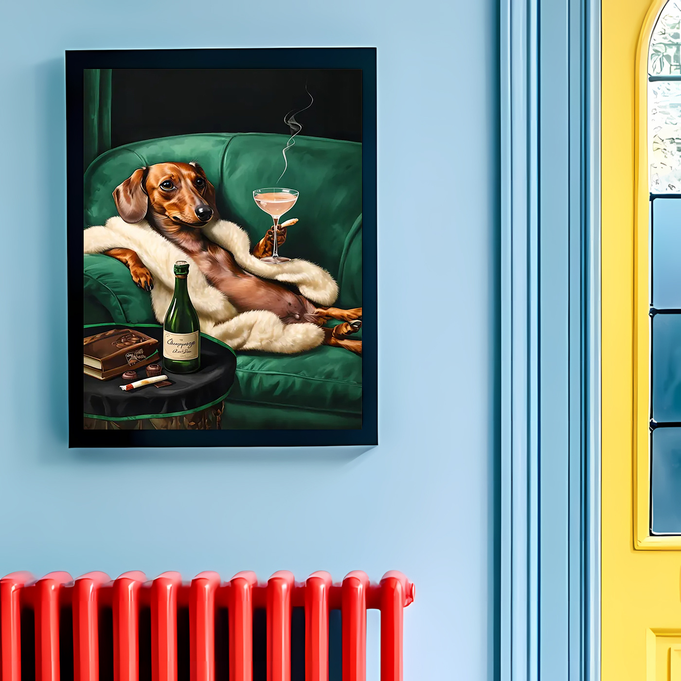 2D Flat, 1pc 12x16 Inch Unframed Dachshund Art Print - Whimsical Dog Portrait with Martini & Cigar on Vibrant Green Couch, Humorous Pet Lover Gift, Detailed Brushwork Canvas Wall Decor for Living Room, Bedroom, Office, Cafe, Bedroom Artwork, Playful Design, Rich Texture Detail, 2D Flat