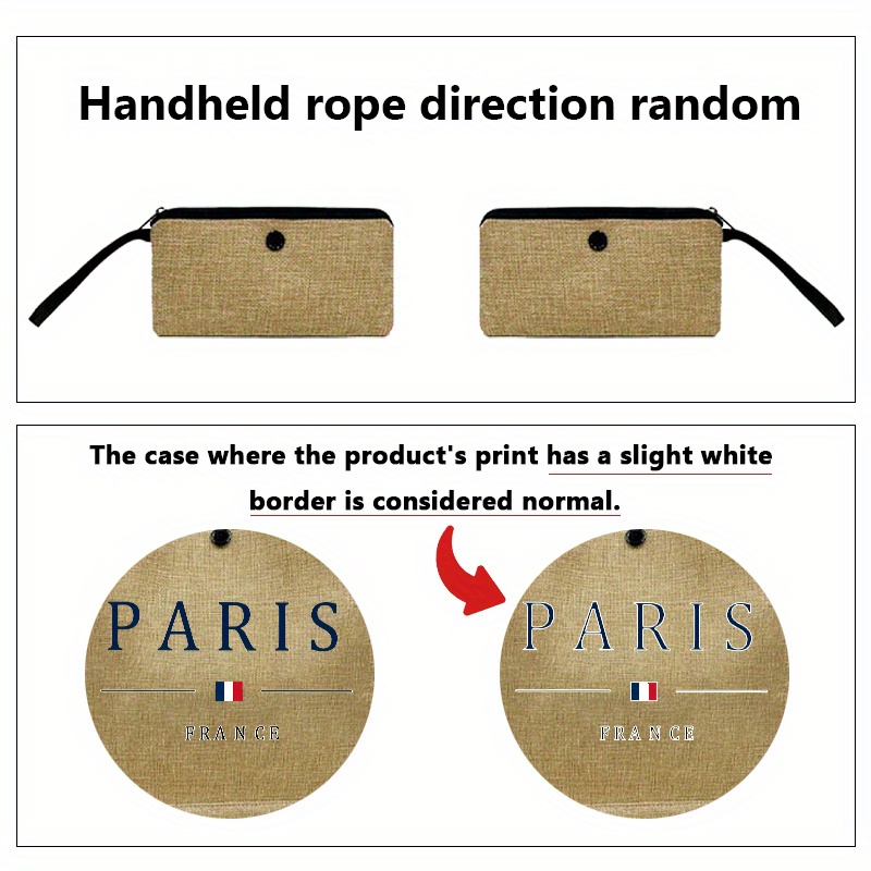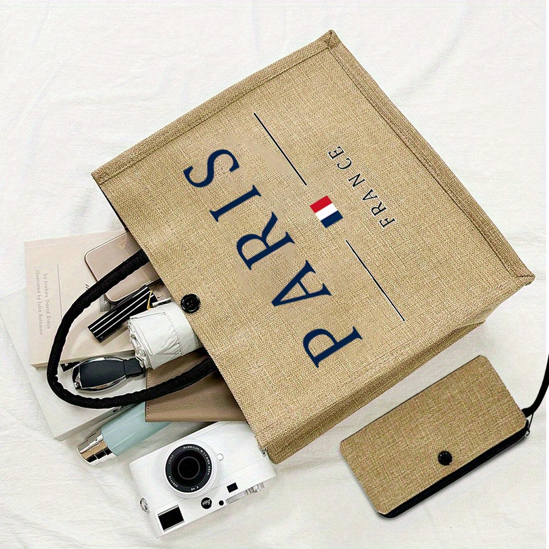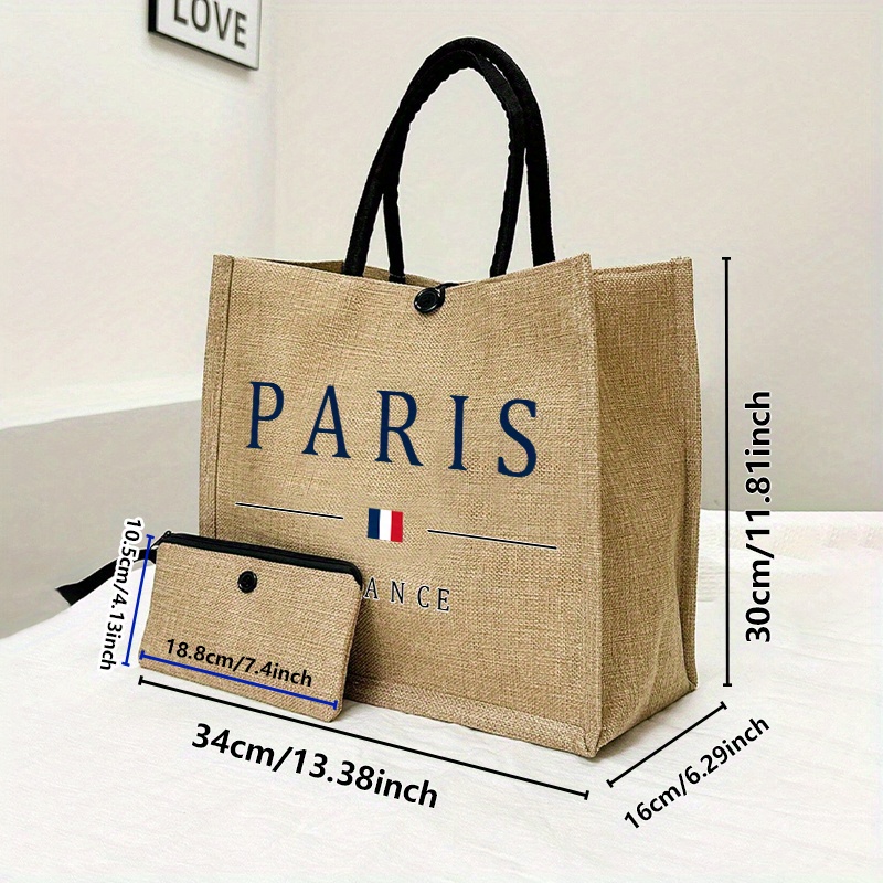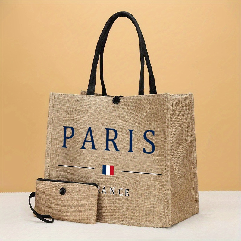 2pcs Elegant Durable linen Tote Bag Coin purse- Paris France Design with Tricolor Flag Detail Large Capacity Work Shoulder Bag Fixed Shoulder Straps and Matching Cosmetics Pouch for Women's tote bags Professional One Shoulder Commuter Handbag