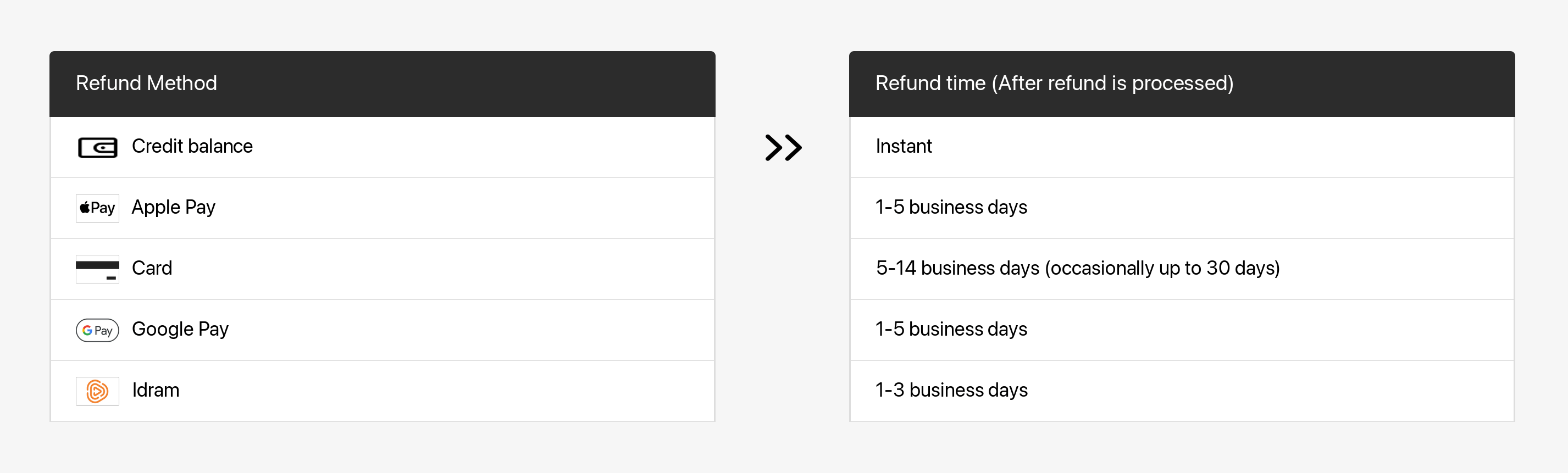 Once the refund is processed, your financial institution will need additional time to have it reflected in your account. Refer to the following table for more details.