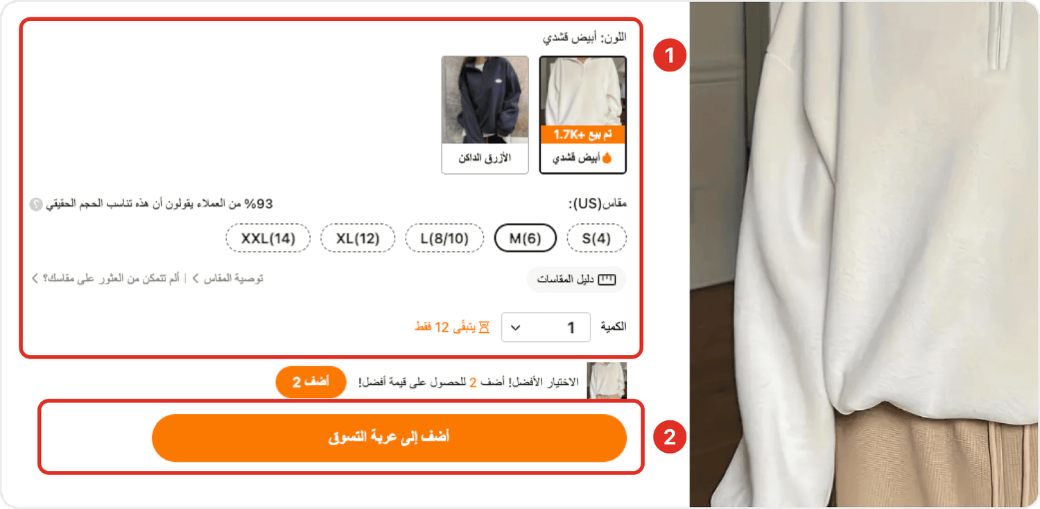 1. ابحث عن السلع التي تعجبك وحدد اللون والمقاس والكمية التي تريد شراءها.