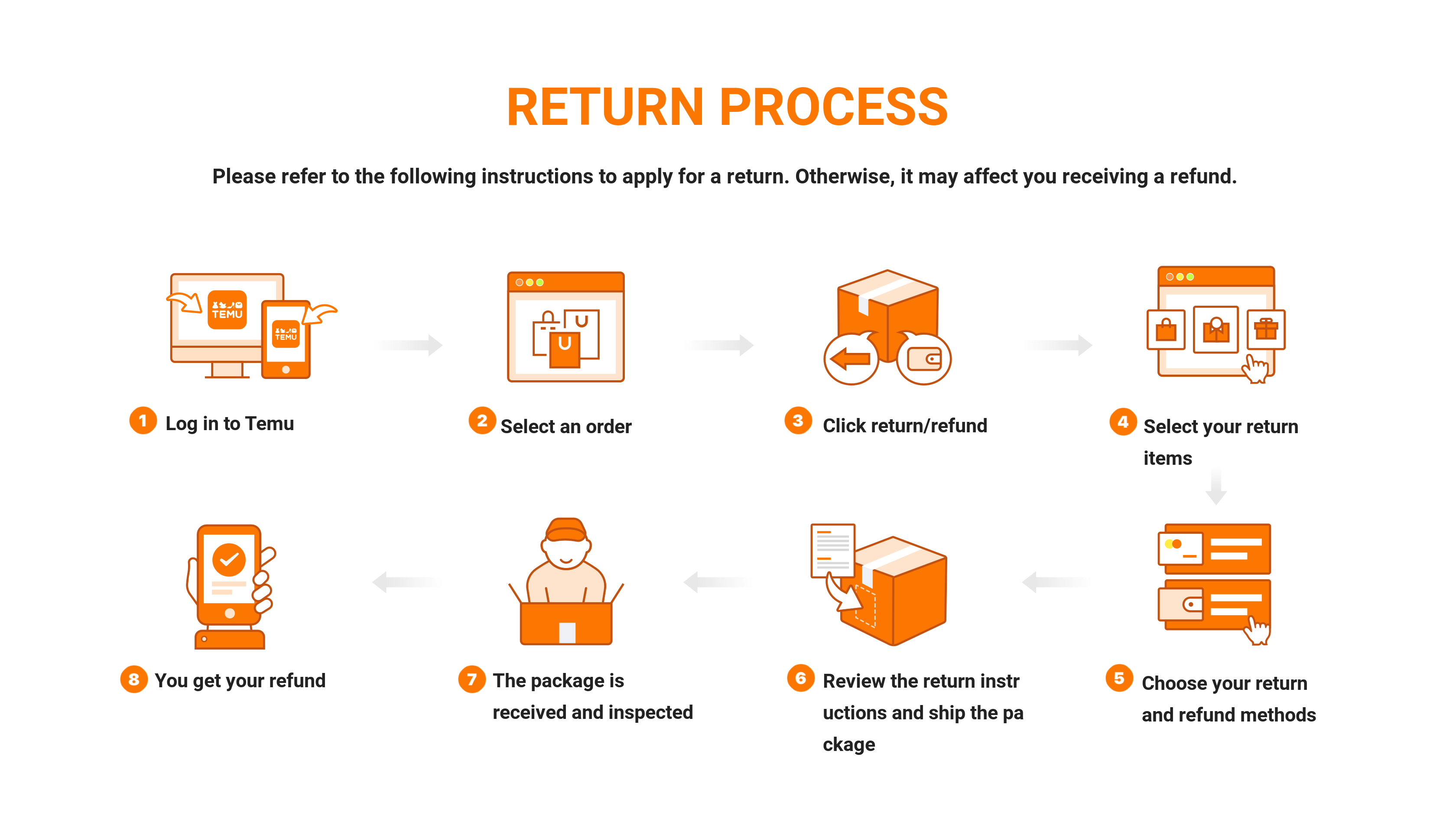 VI. You can check the refund status of your items on your order details page or through Temu's SMS/Email/Push notifications.