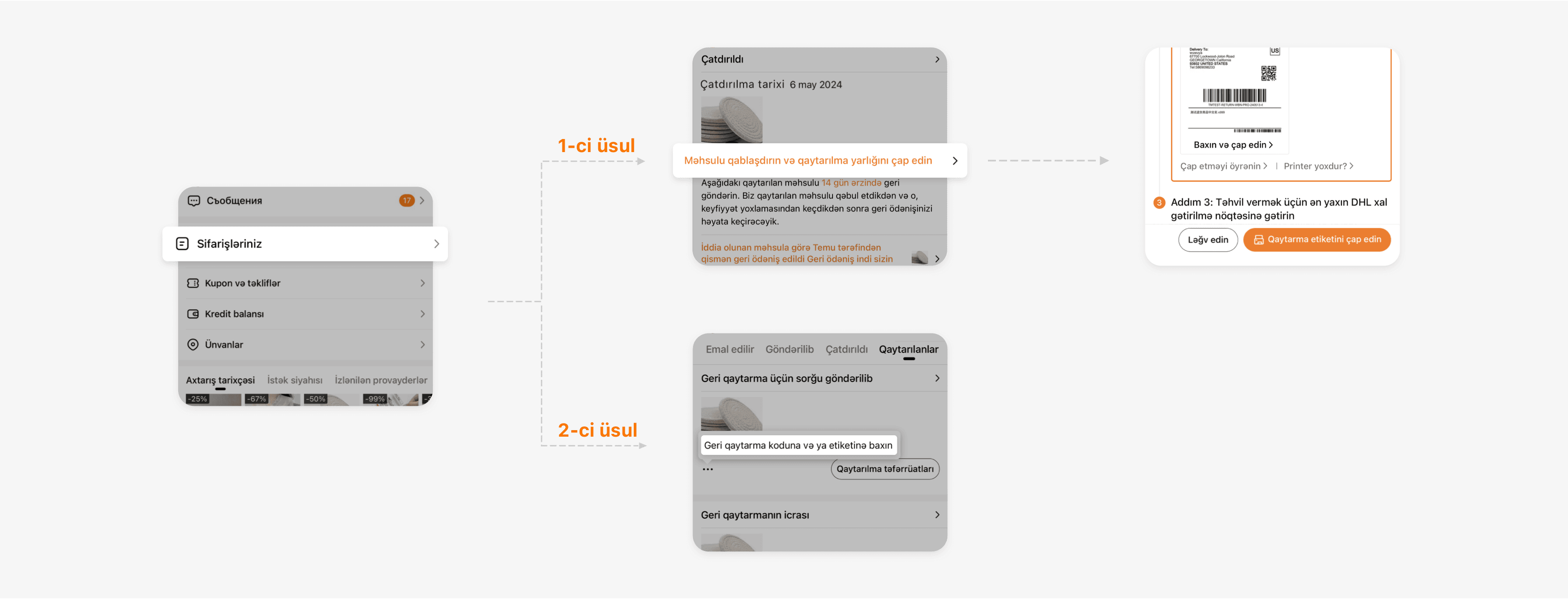 Geri qaytarma etiketinizi "Sifarişləriniz" bölməsində iki fərqli yerdə tapa bilərsiniz