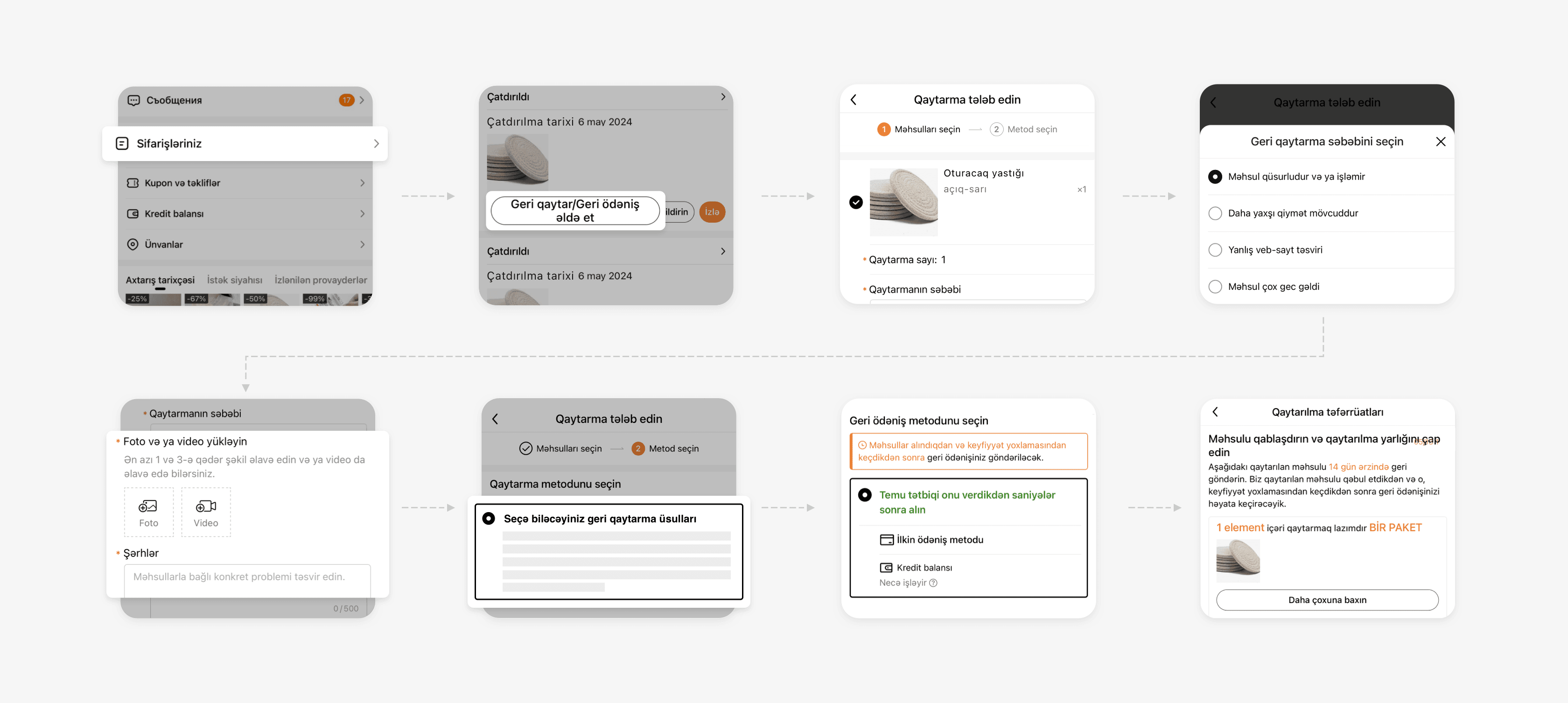 "Temu"da aldıqlarınız sizi qane etmirsə, bu Qaytarma və geri ödəniş siyasətində göstərilən sadə prosedura əməl etməklə onu geri qaytarmaq və geri ödəniş almaq üçün tələblərə cavab verə bilərsiniz.