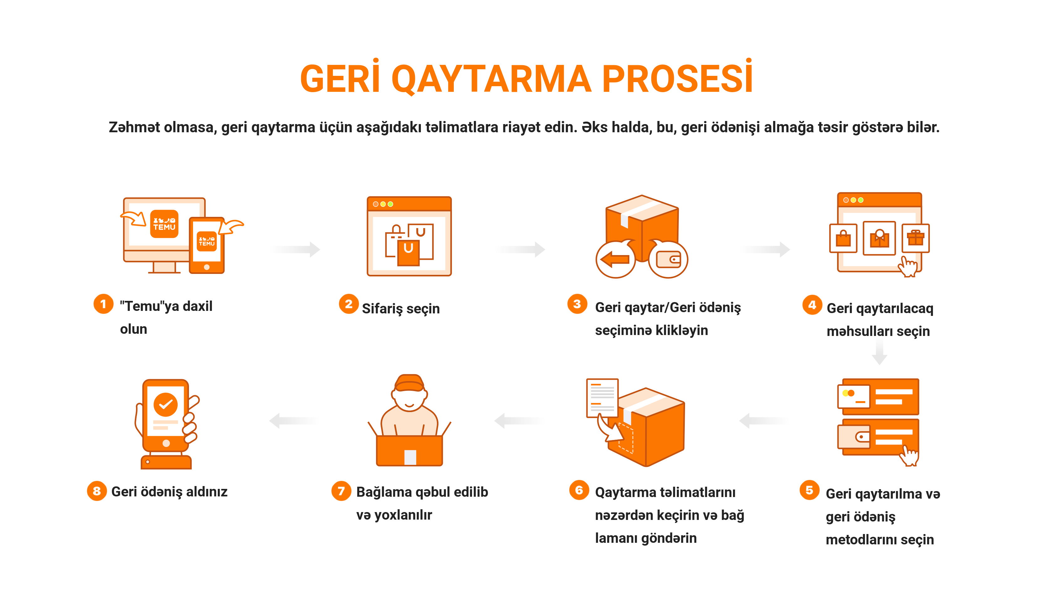 Satıcılar müəyyən məhsulların geri qaytarma üçün uyğun olmadığını, "Temu" geri qaytarma və geri ödəniş siyasəti"nə tabe olduğunu qeyd edə bilərlər. Ətraflı məlumat üçün məhsulun təfərrüatına dair səhifələrə baxın.