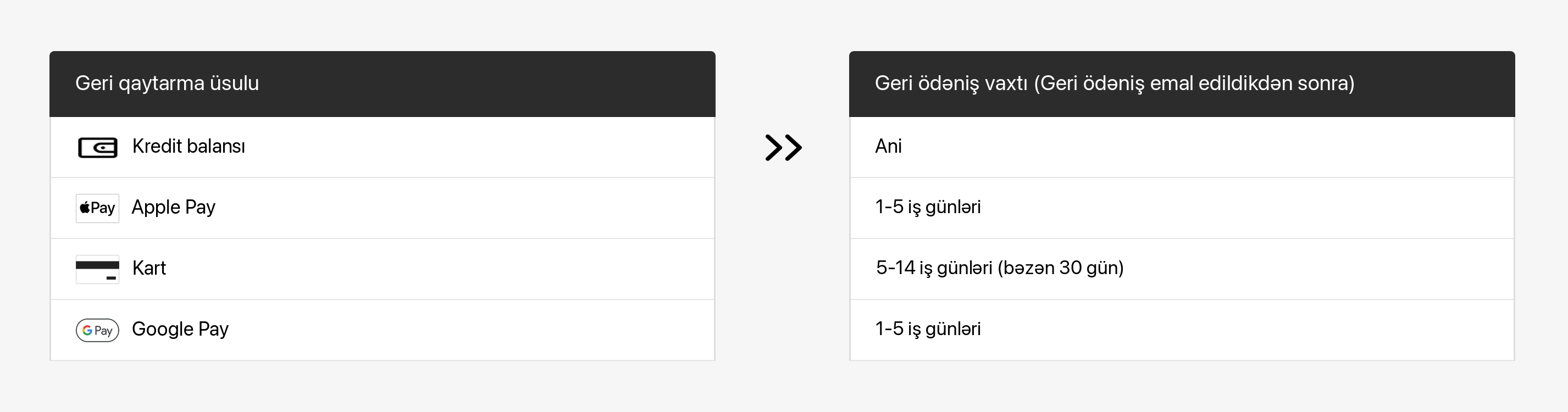 Geri ödəniş emal edildikdən sonra maliyyə qurumunuzun məbləği hesabınızda göstərməsi üçün əlavə vaxta ehtiyacı olacaq. Daha ətraflı məlumat üçün aşağıdakı cədvələ istinad edin.