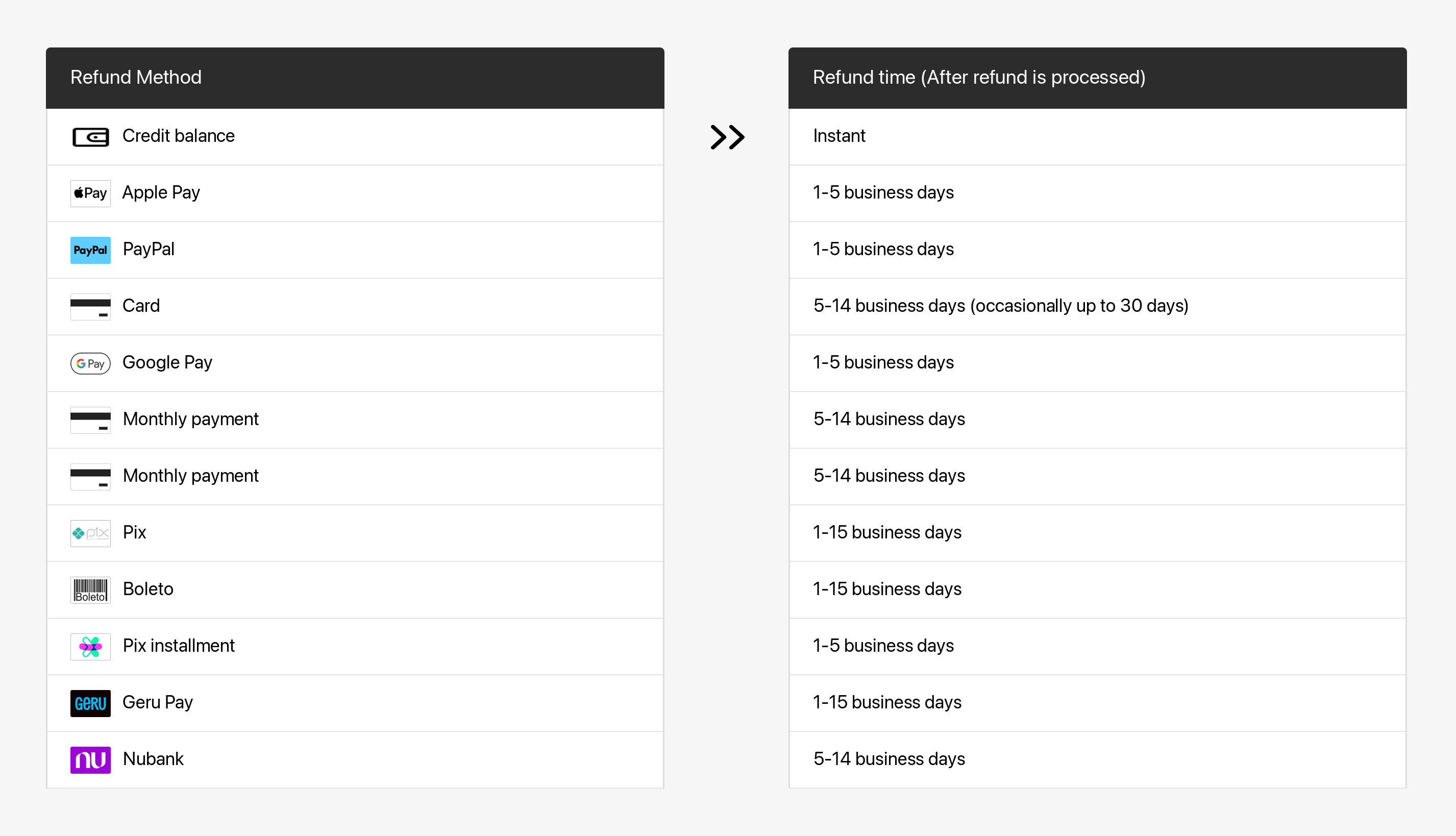 Once the refund is processed, your financial institution will need additional time to have it reflected in your account. Refer to the following table for more details.