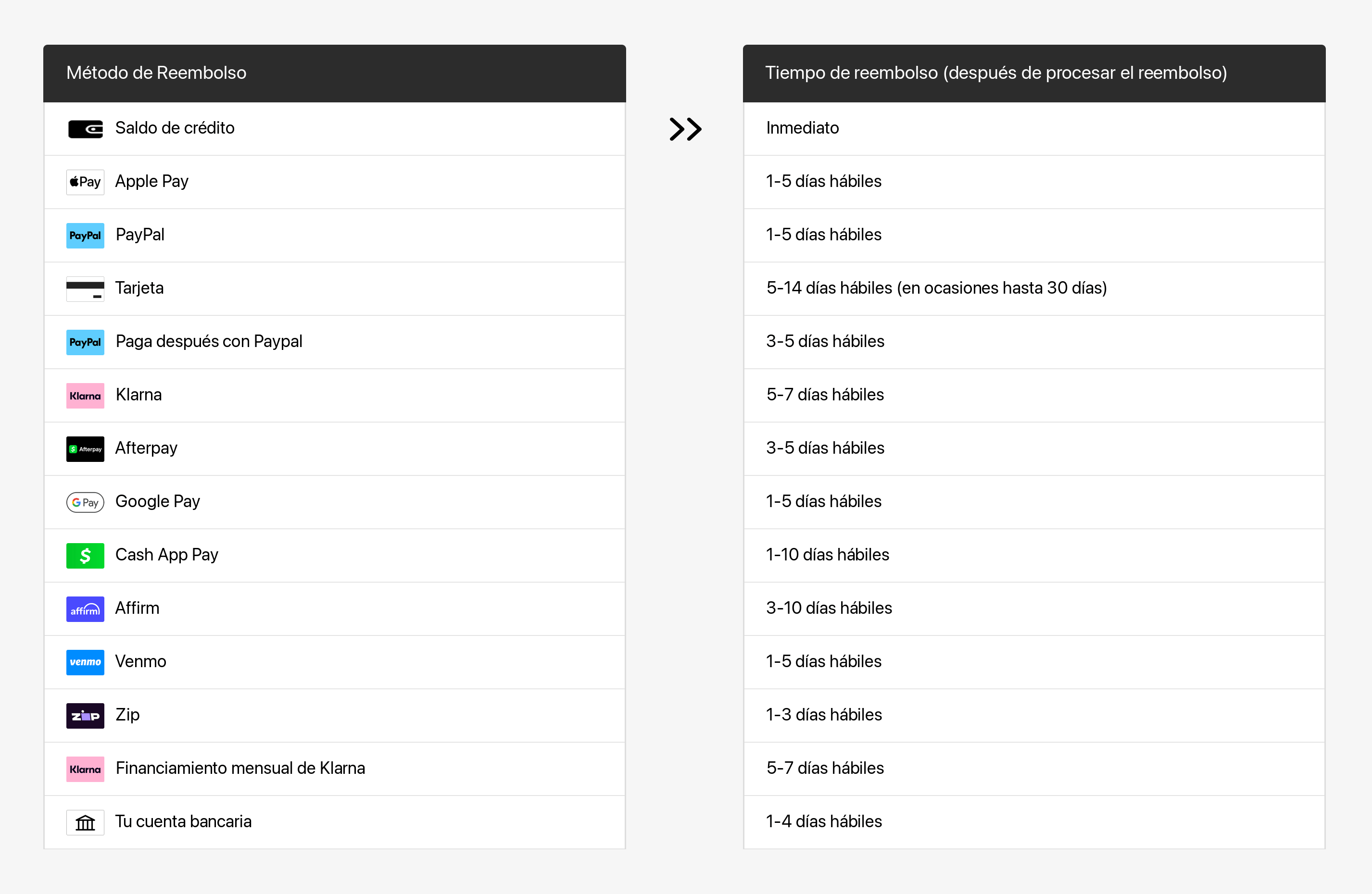 Após o processamento do reembolso, sua instituição financeira ainda levará mais um tempo para exibi-lo em sua conta. Consulte a tabela a seguir para obter mais detalhes.