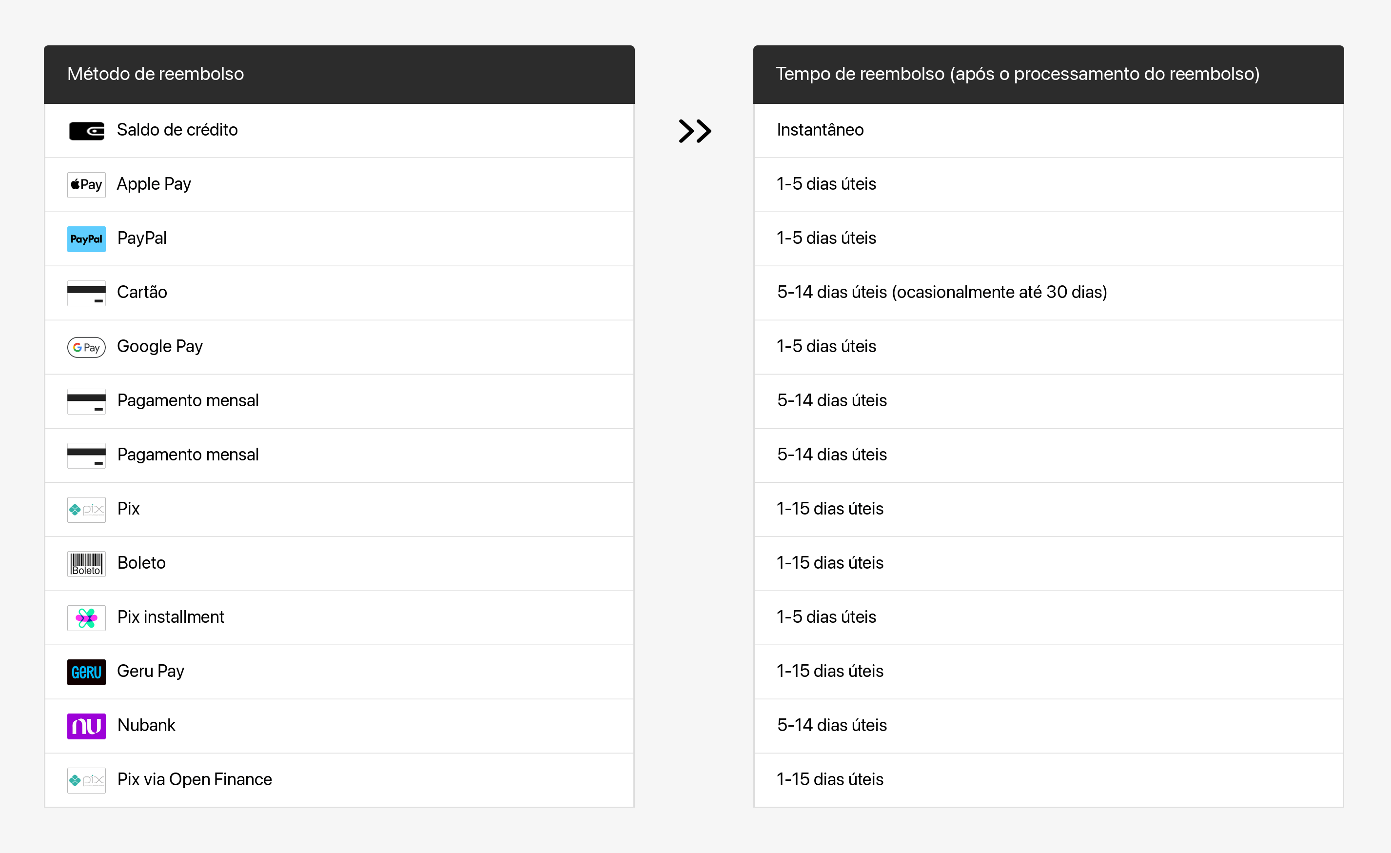 VI. Dependendo da sua instituição financeira, os reembolsos podem levar de 5 a 14 dias úteis (até 30 dias) para serem creditados na sua conta de pagamento original.