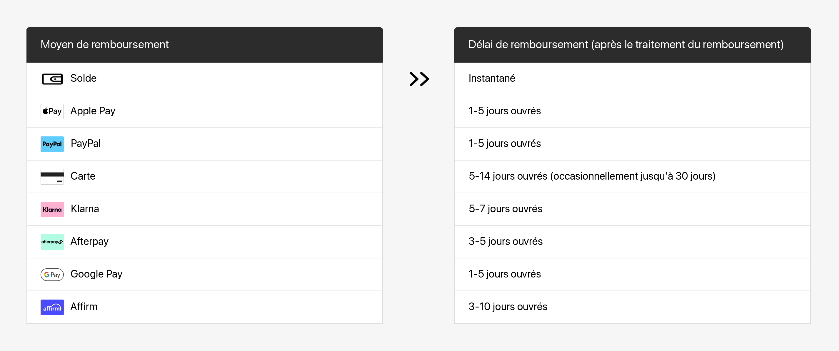 Une fois le remboursement traité, il faudra un certain temps pour qu'il apparaisse sur votre compte bancaire. Reportez-vous au tableau suivant pour en savoir plus.
