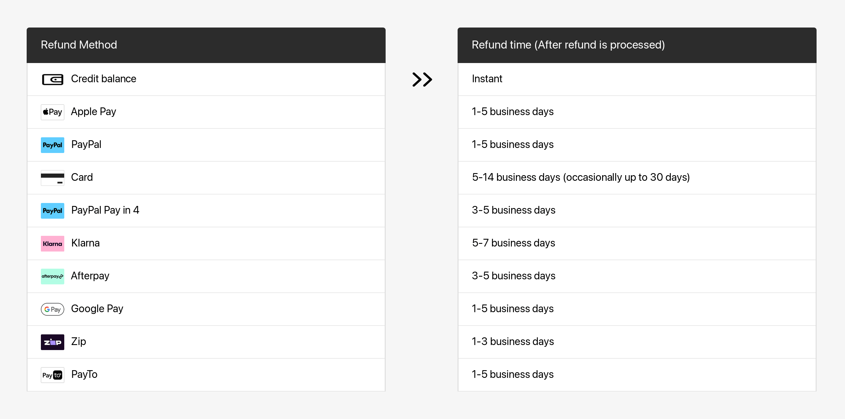 Once the refund is processed, your financial institution will need additional time to have it reflected in your account. Refer to the following table for more details.