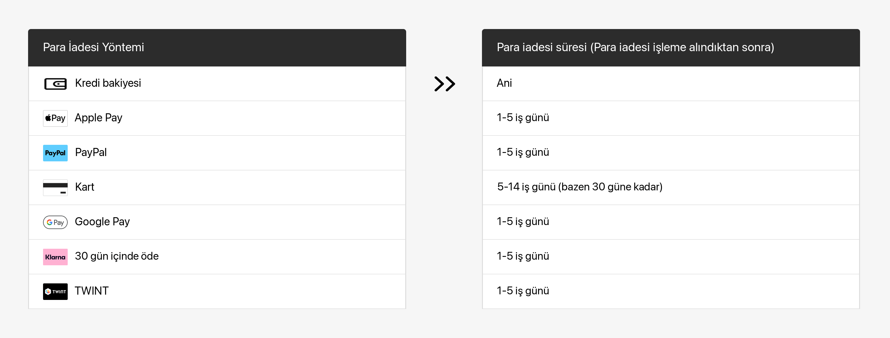 Para iadesi işleme alındığında, finans kuruluşunuzun hesabınıza yansıtılması için ek süreye ihtiyacı olacaktır. Daha fazla ayrıntı için aşağıdaki tabloya bakın.