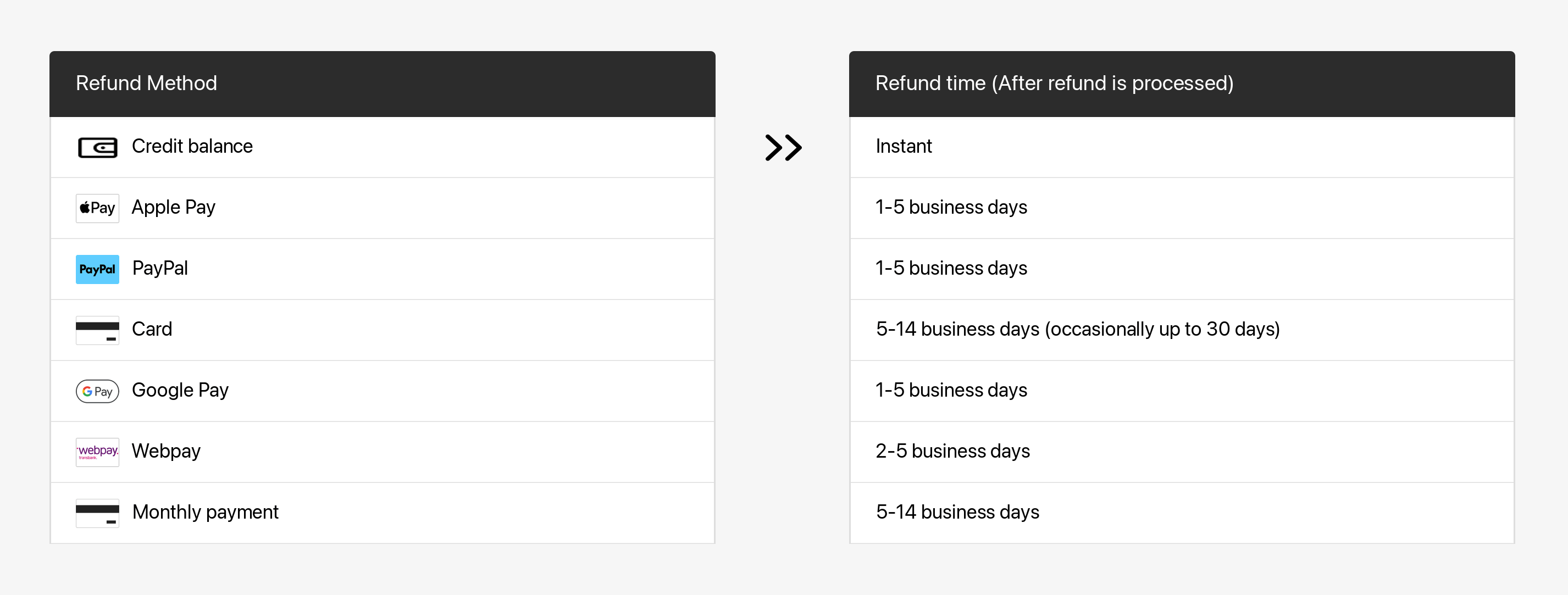 Once the refund is processed, your financial institution will need additional time to have it reflected in your account. Refer to the following table for more details.