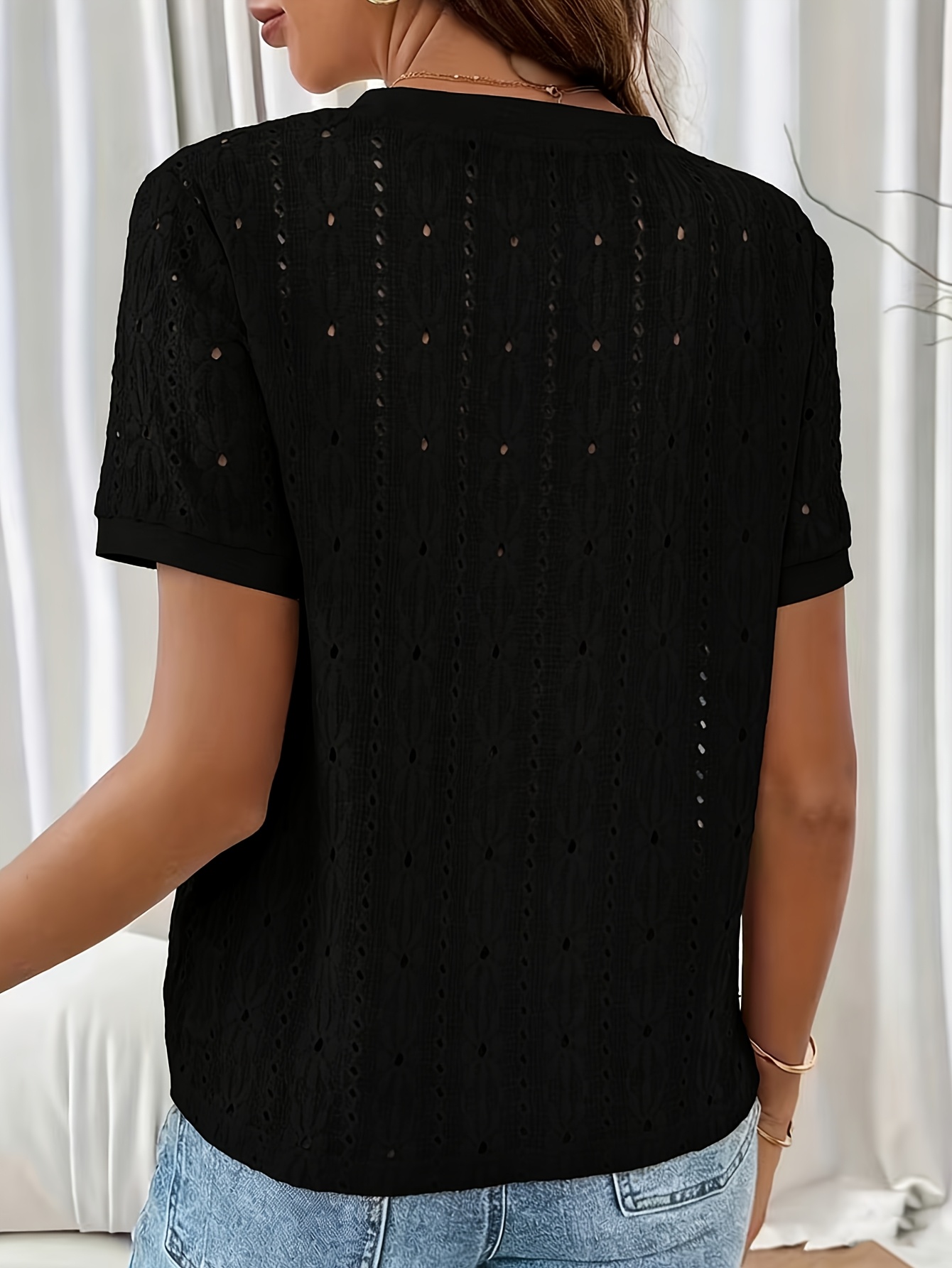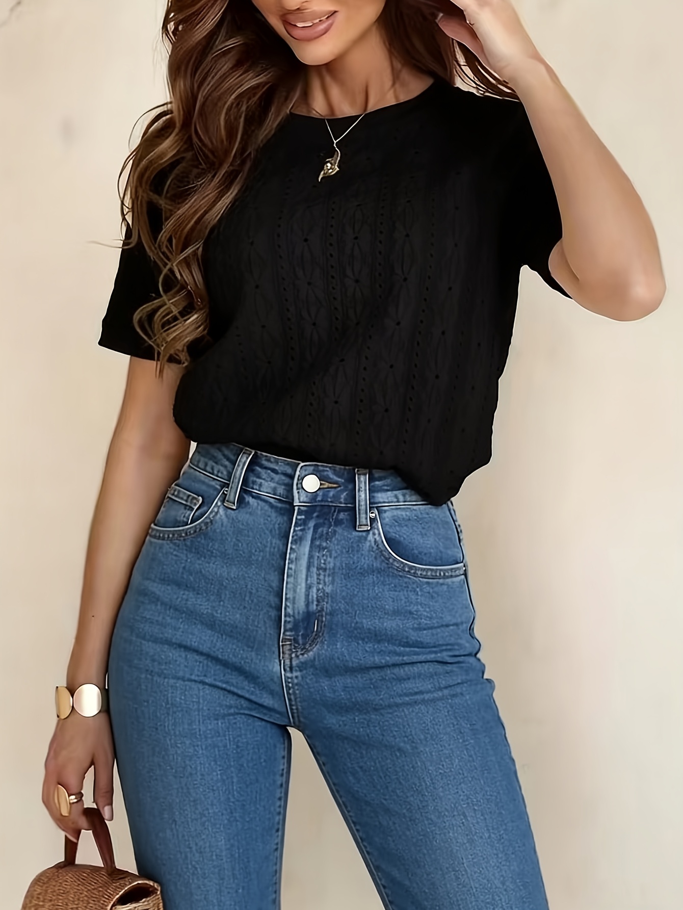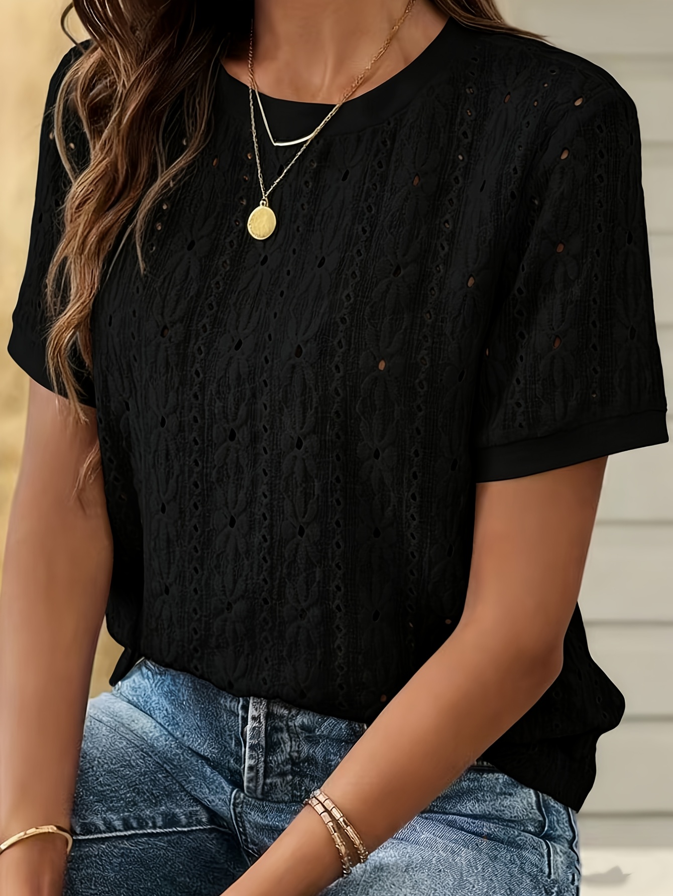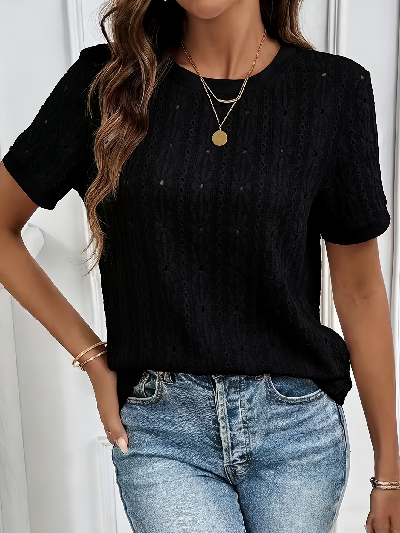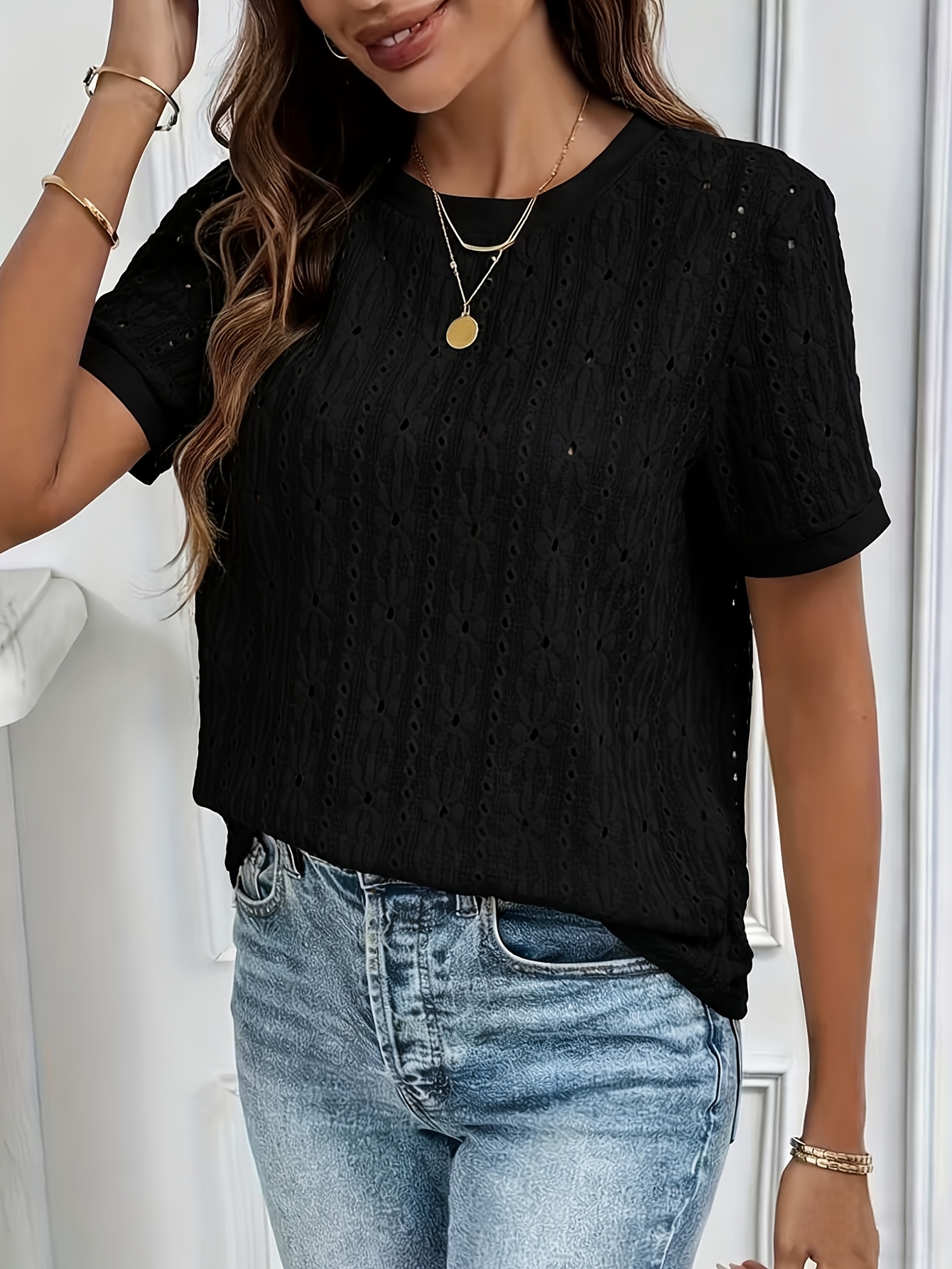2026 Primavera/Verano Nueva Camiseta de Viaje Texturizada Jacquard Hueca de Manga Corta con Cuello Redondo, Top Casual y Minimalista para Mujer