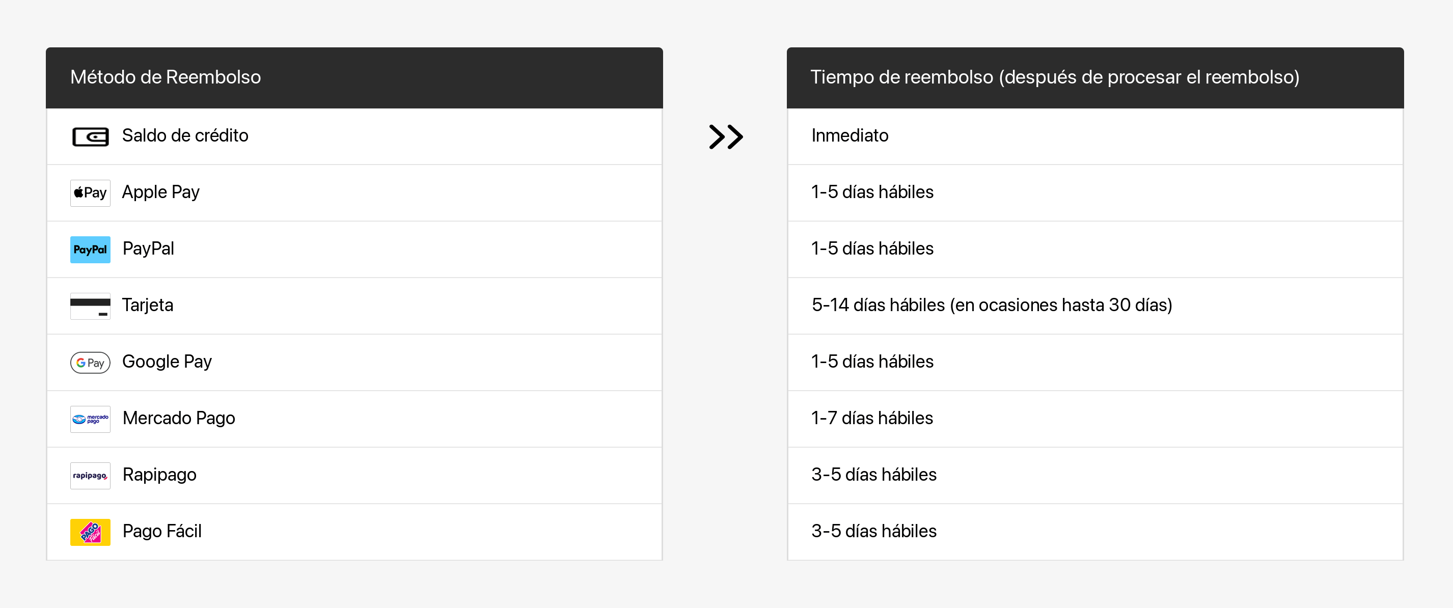 Una vez que se procese el reembolso, tu institución financiera necesitará tiempo adicional para que se refleje en tu cuenta. Consulta la siguiente tabla para obtener más detalles.