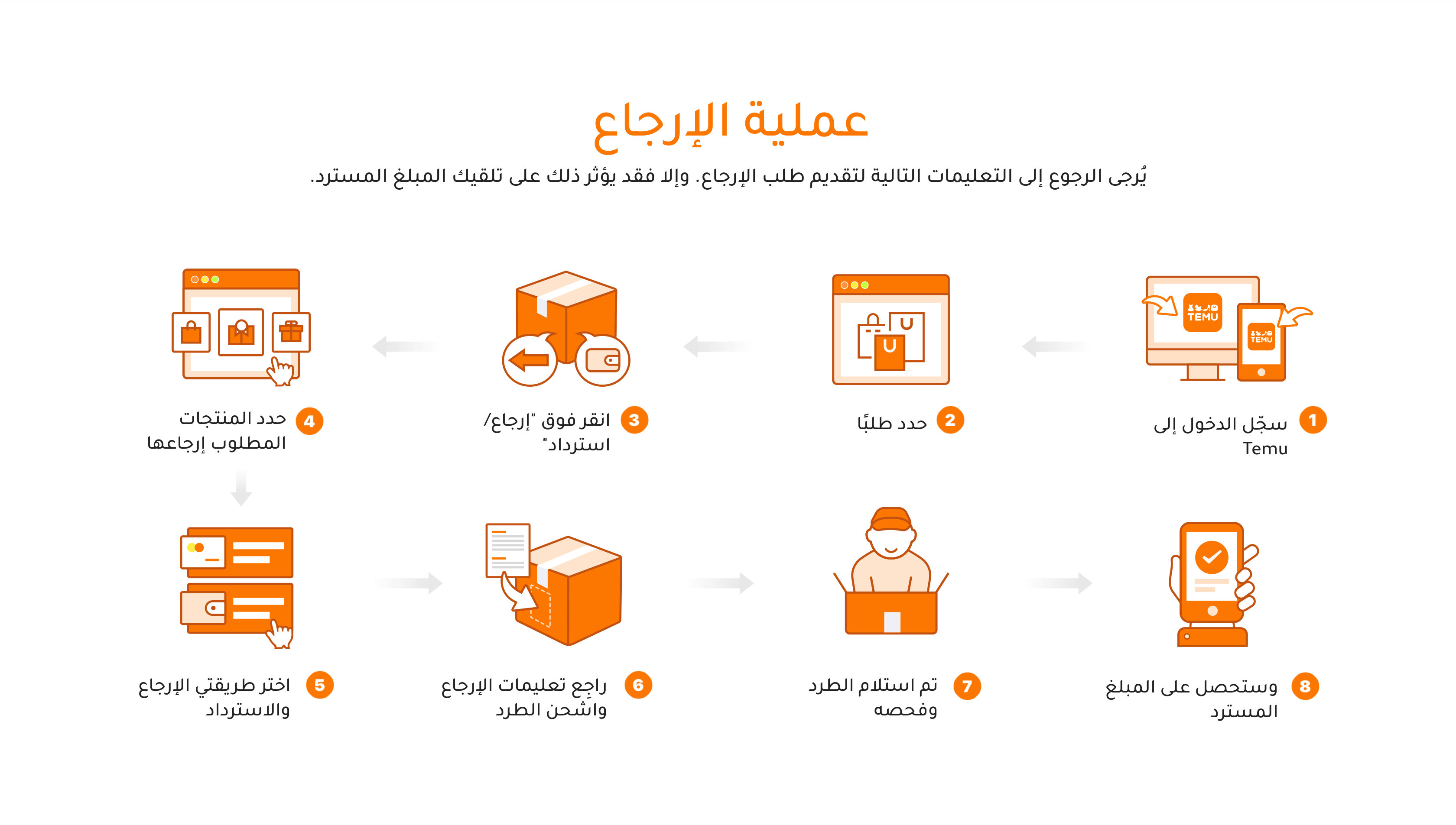 إذا لم تشعر بالرضا نحو ما اشتريته من Temu، فقد تكون مؤهلاً لإرجاعه واسترداد الأموال باتباع الإجراء البسيط المنصوص عليه في سياسة "الإرجاع ورد الأموال" هذه.