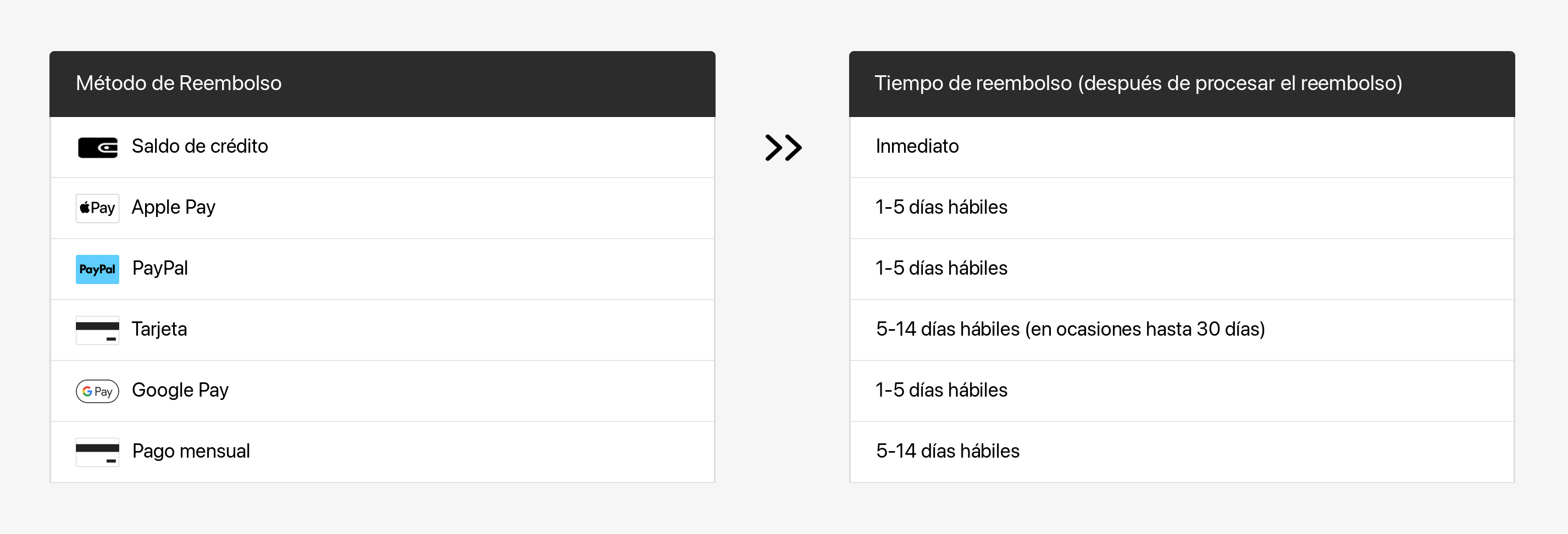 Una vez que se procese el reembolso, tu institución financiera necesitará tiempo adicional para que se refleje en tu cuenta. Consulta la siguiente tabla para obtener más detalles.