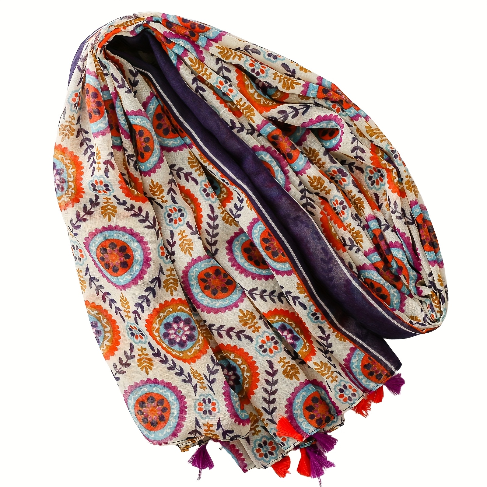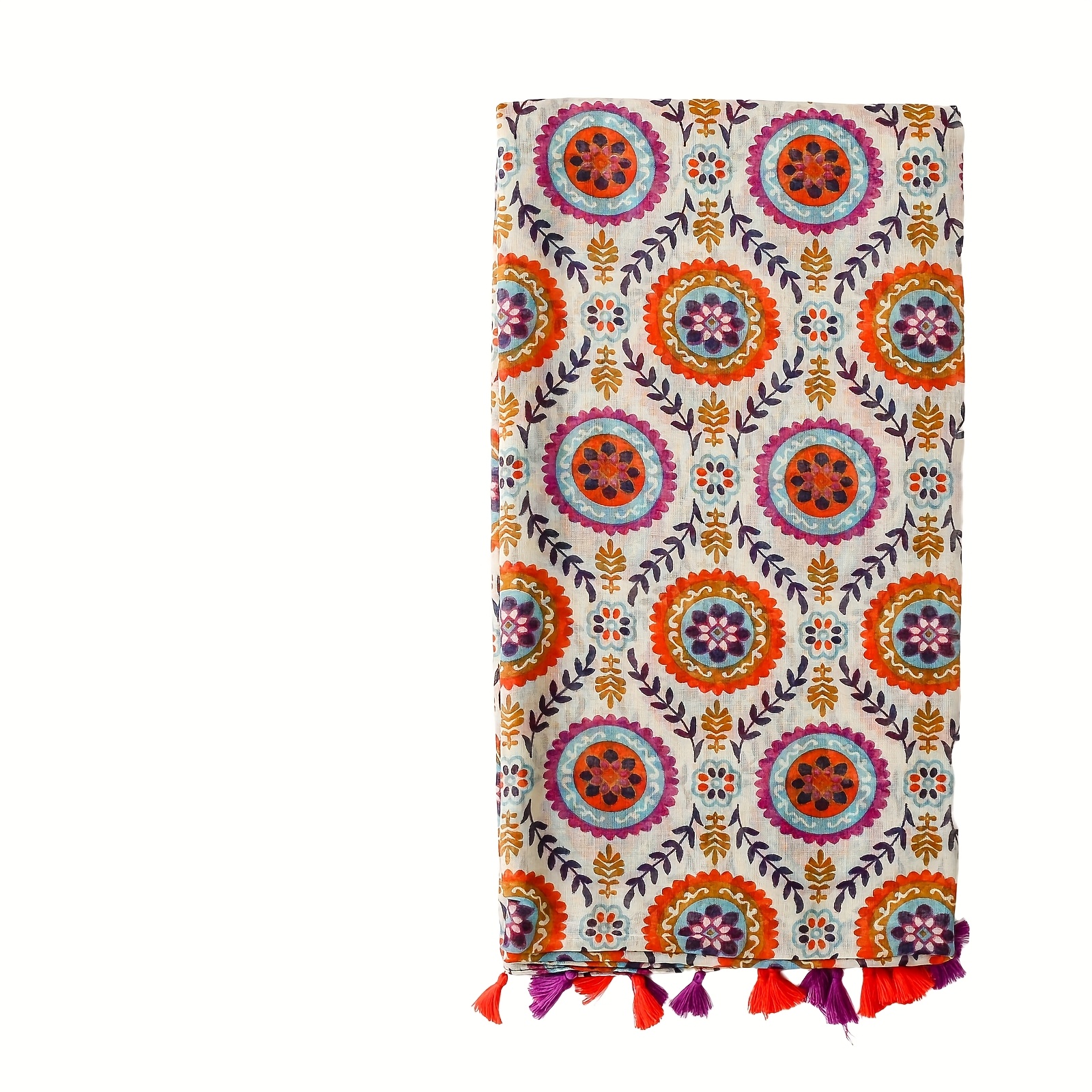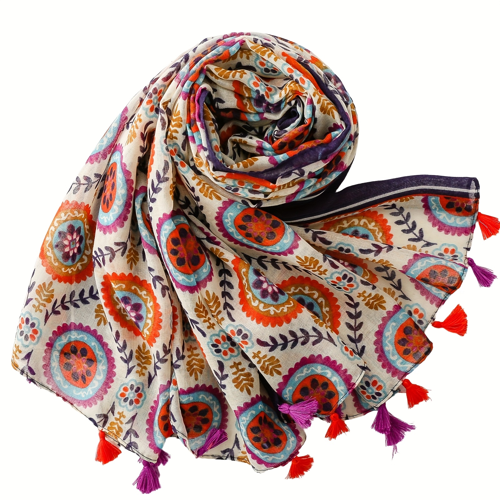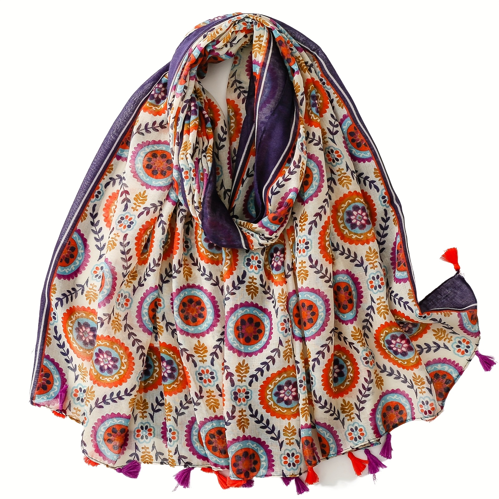 Eșarfă pentru femei în stil boem vintage etnic, cu imprimeu, modele botanice florale și geometrice cu ciucuri, culori vibrante, pentru ținută, stil de vacanță romantic, de călătorie, eșarfă musulmană pentru cap