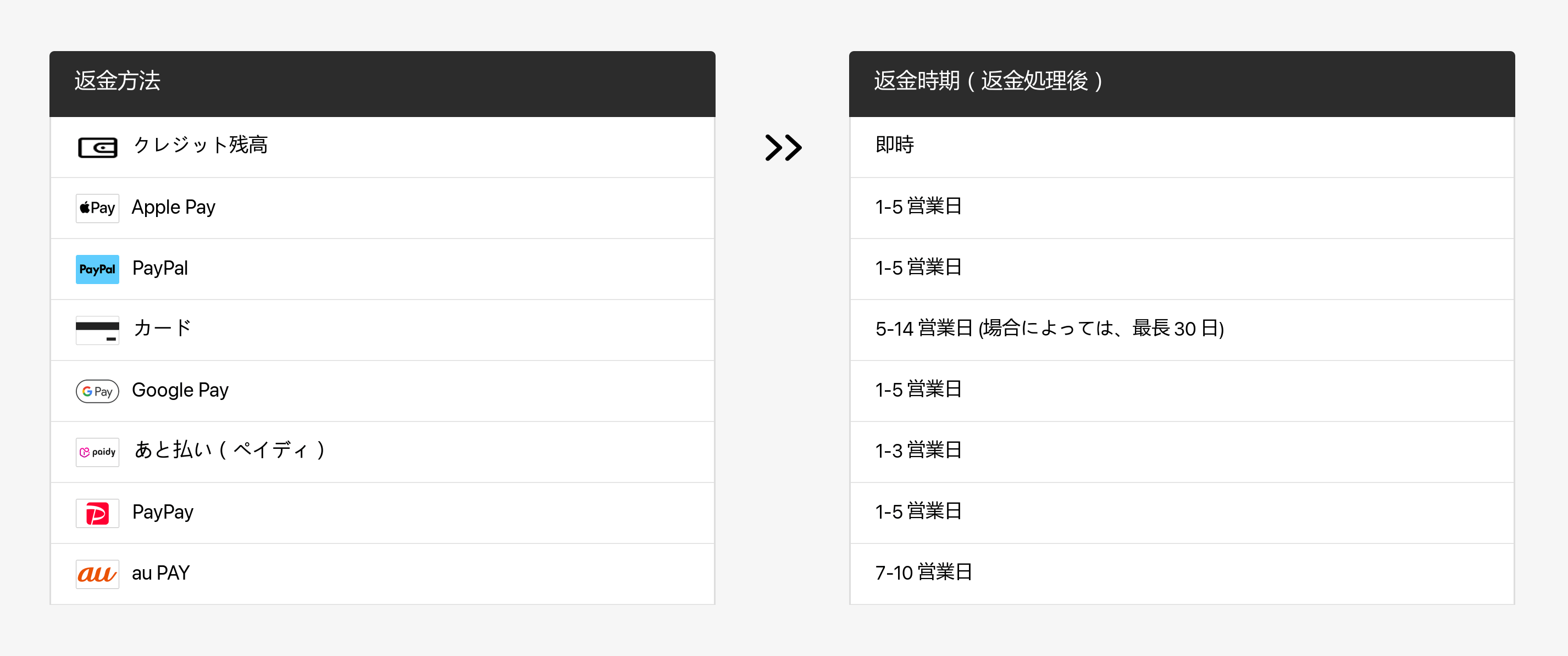 返金が処理された後、金融機関の口座に反映されるまでにはさらに時間がかかります。 詳細は以下の表をご参照ください。