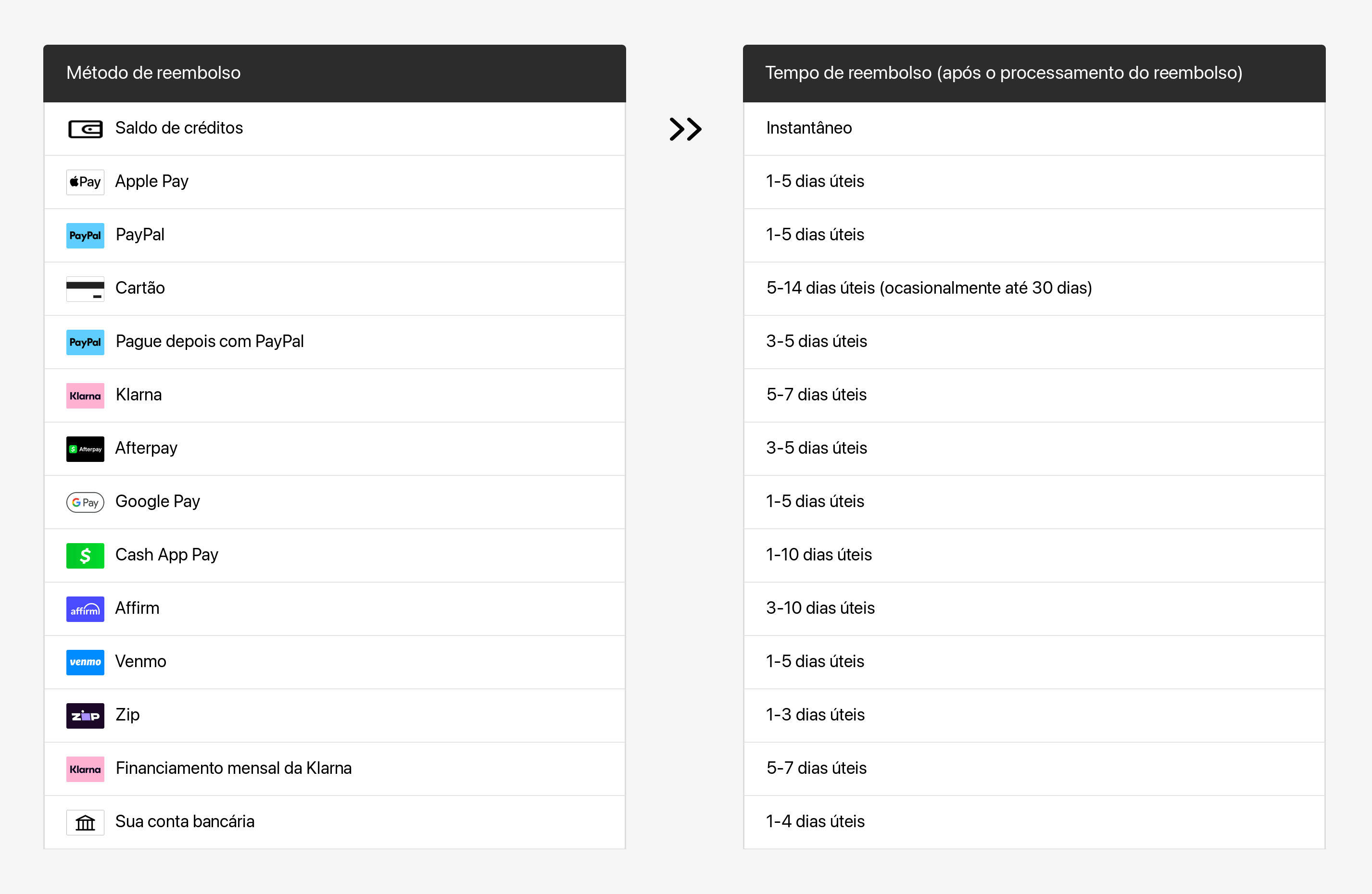 Após o processamento do reembolso, sua instituição financeira ainda levará mais um tempo para exibi-lo em sua conta. Consulte a tabela a seguir para obter mais detalhes.
