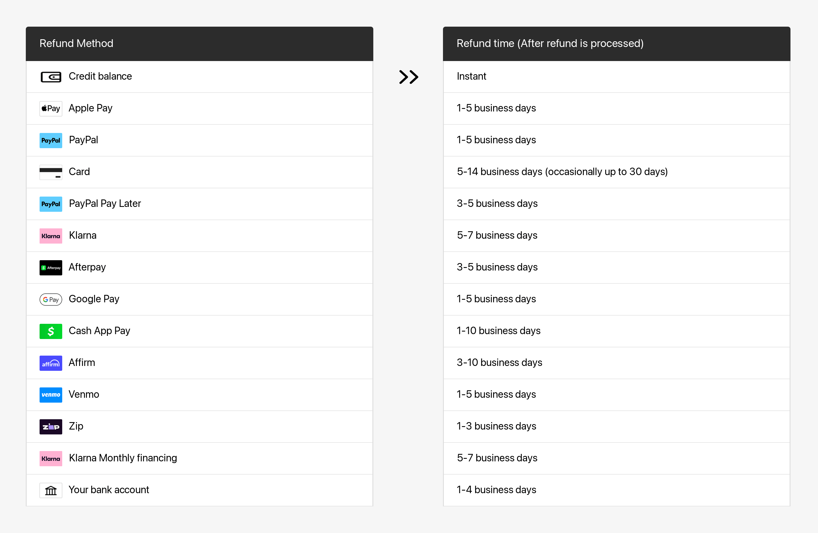 Once the refund is processed, your financial institution will need additional time to have it reflected in your account. Refer to the following table for more details.