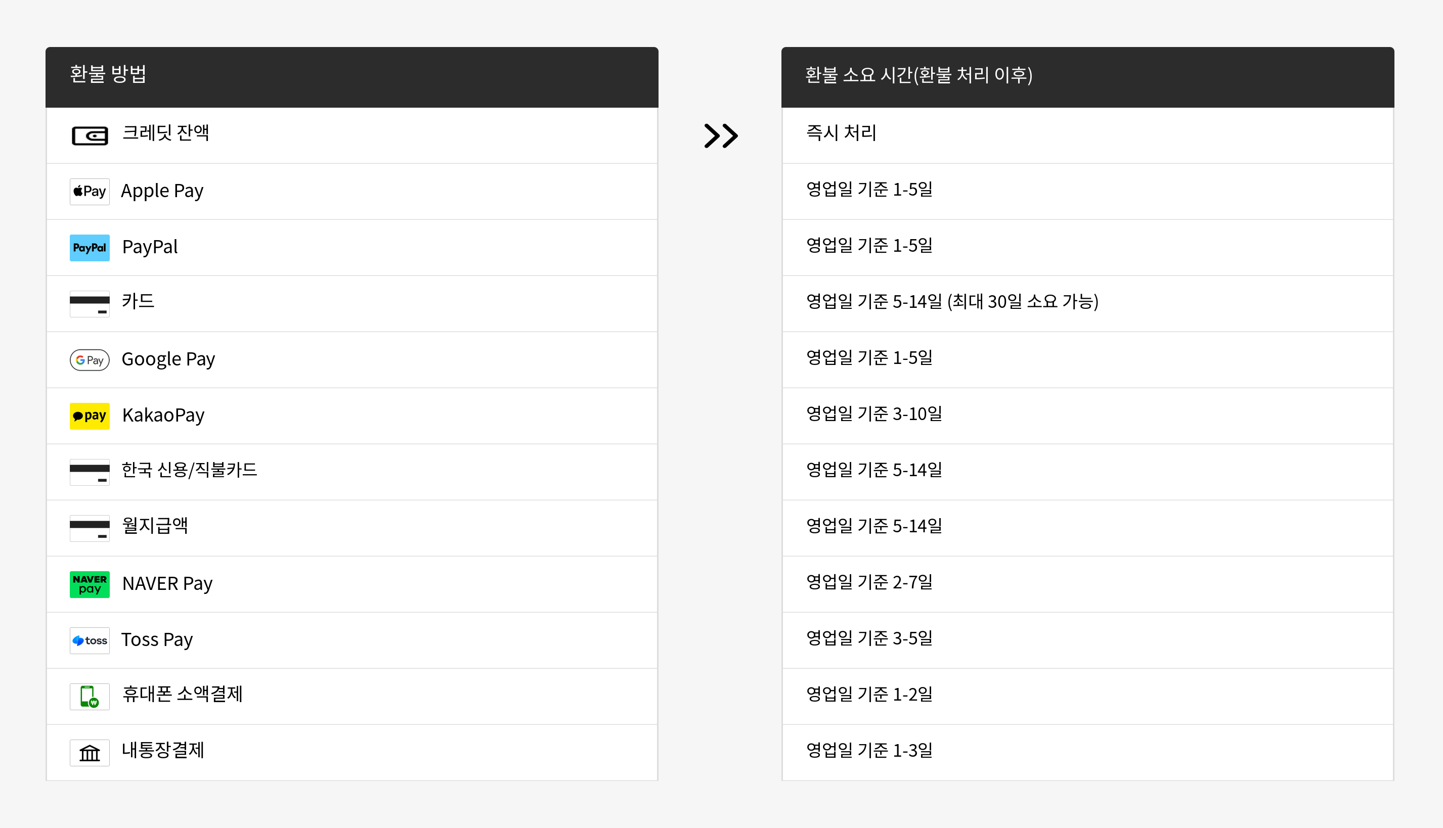 환불이 처리된 이후, 금융 기관에서 귀하의 계좌에 환불 금액을 반영하기까지 추가 시간이 소요됩니다. 자세한 내용은 다음 표를 참조해 주세요.