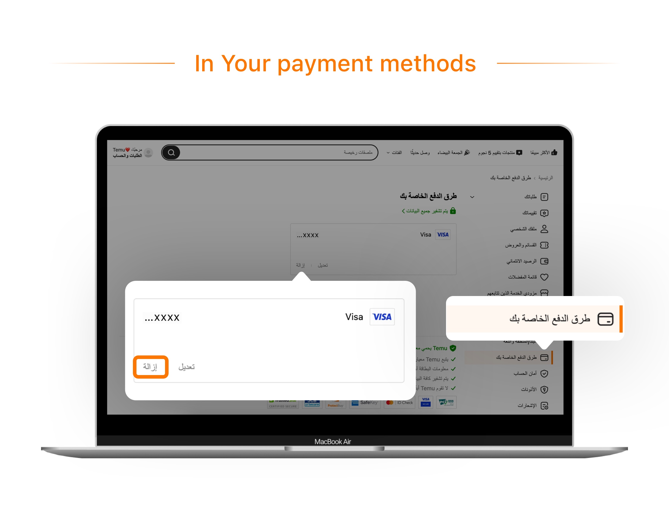 ضمن طرق الدفع، انقر فوق تعديل لحذف بطاقتك.