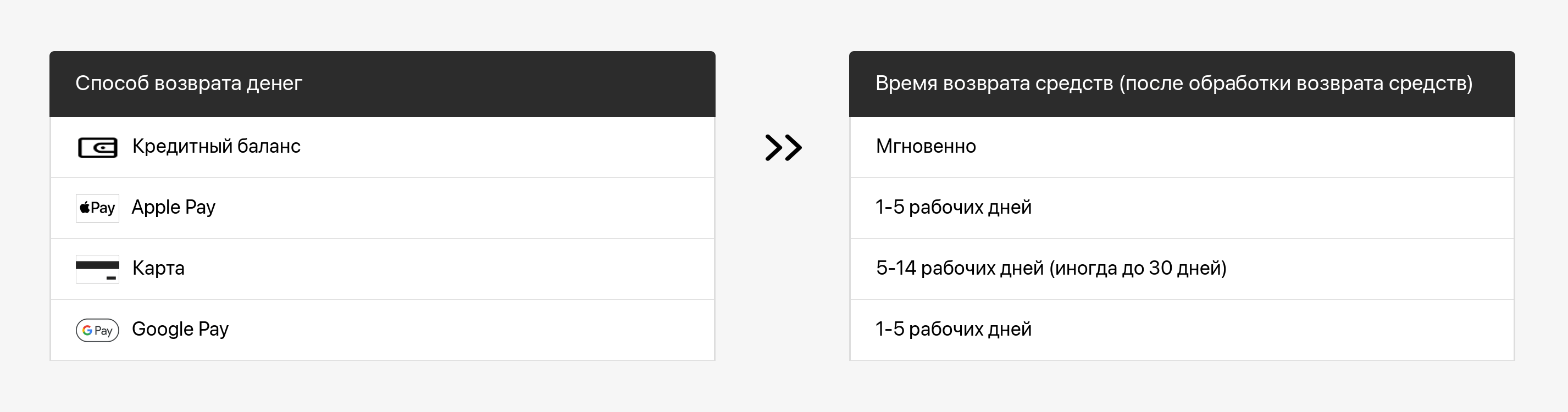Как только возврат средств будет обработан, вашему финансовому учреждению потребуется дополнительное время, чтобы зачислить его на ваш счет. Дополнительные сведения см. в таблице ниже.
