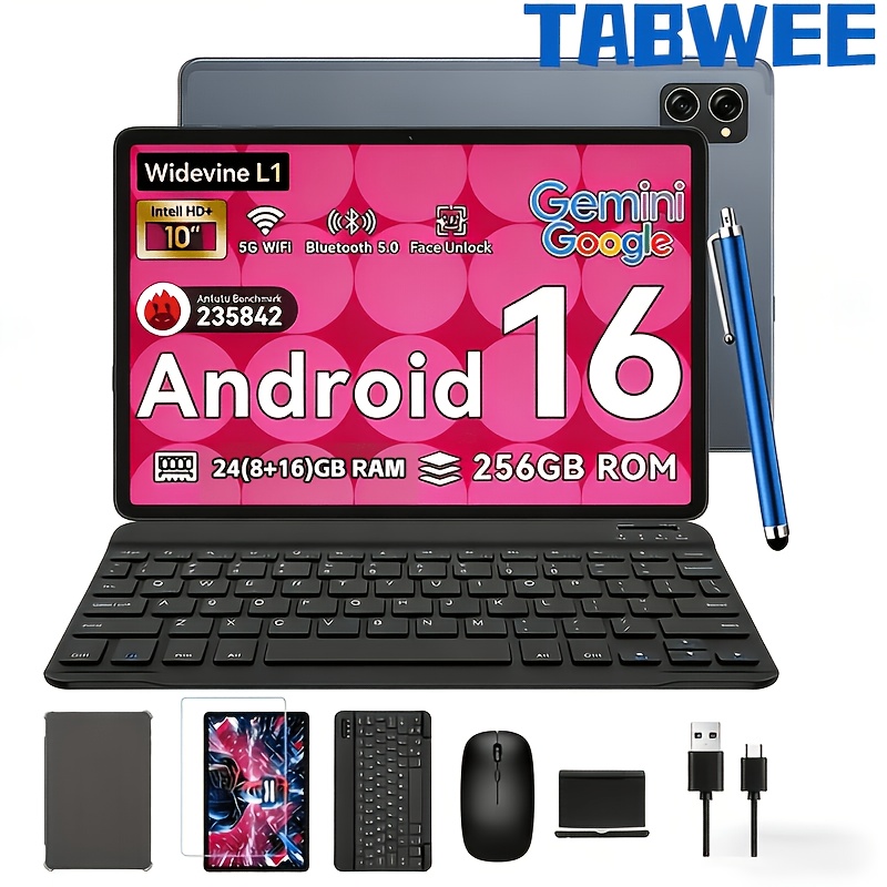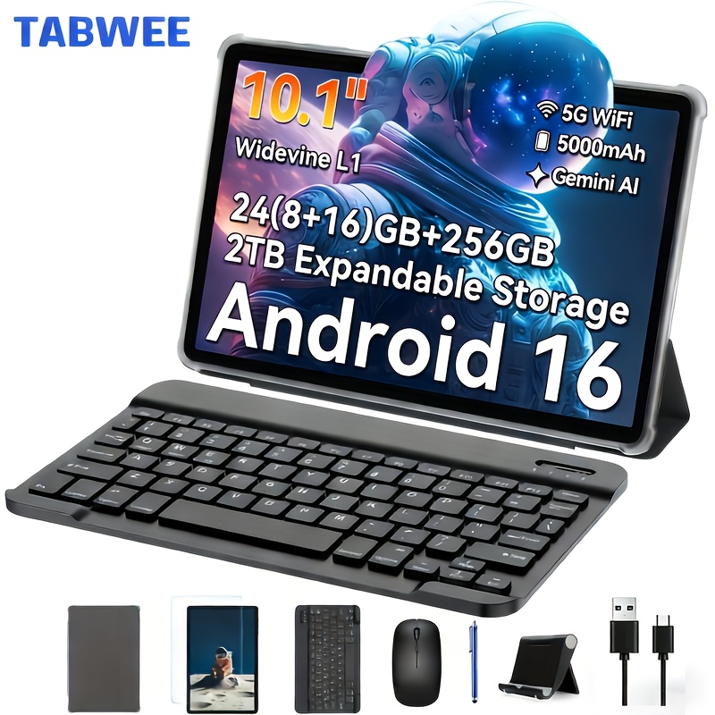 تابلت TABWEE T20 Android 16 جديد 2025، شاشة كبيرة HD مقاس 10.1 بوصة، شاشة IPS بدقة 1280 × 800، معالج ثماني النواة عالي الأداء، ذاكرة وصول عشوائي (RAM) 24 جيجابايت (8 جيجابايت + 16 جيجابايت توسيع) وذاكرة تخزين داخلية (ROM) 256 جيجابايت ودعم توسيع حتى 2 تيرابايت، كاميرات مزدوجة 8 ميجابكسل + 5 ميجابكسل، بطارية طويلة الأمد 5000 مللي أمبير، تابلت، باد