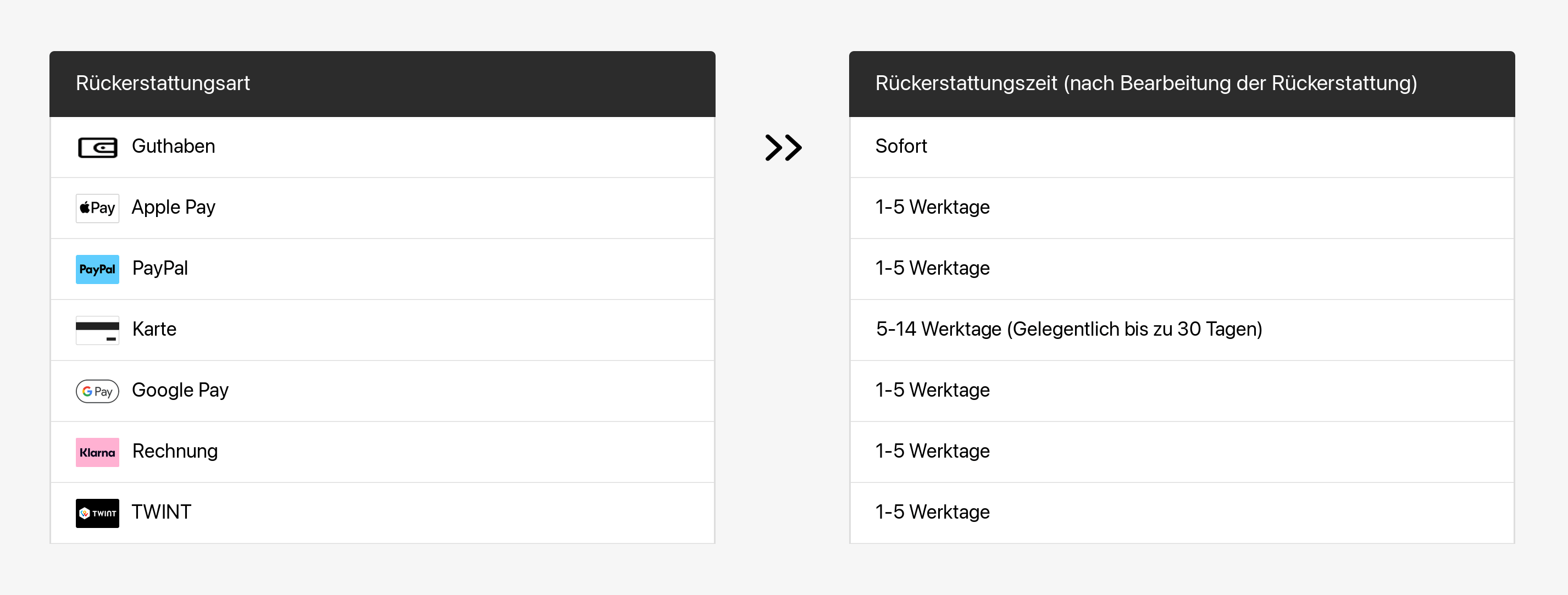 Nachdem die Rückerstattung bearbeitet wurde, dauert es noch etwas, bis dein Finanzinstitut sie auf deinem Konto verbucht hat. Weitere Informationen findest du in der folgenden Tabelle.