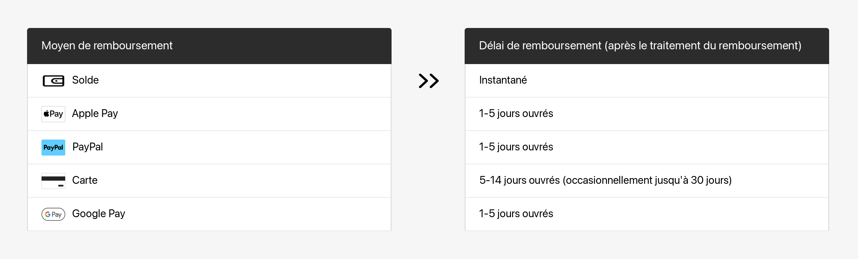 Une fois le remboursement traité, il faudra un certain temps pour qu'il apparaisse sur votre compte bancaire. Reportez-vous au tableau suivant pour en savoir plus.