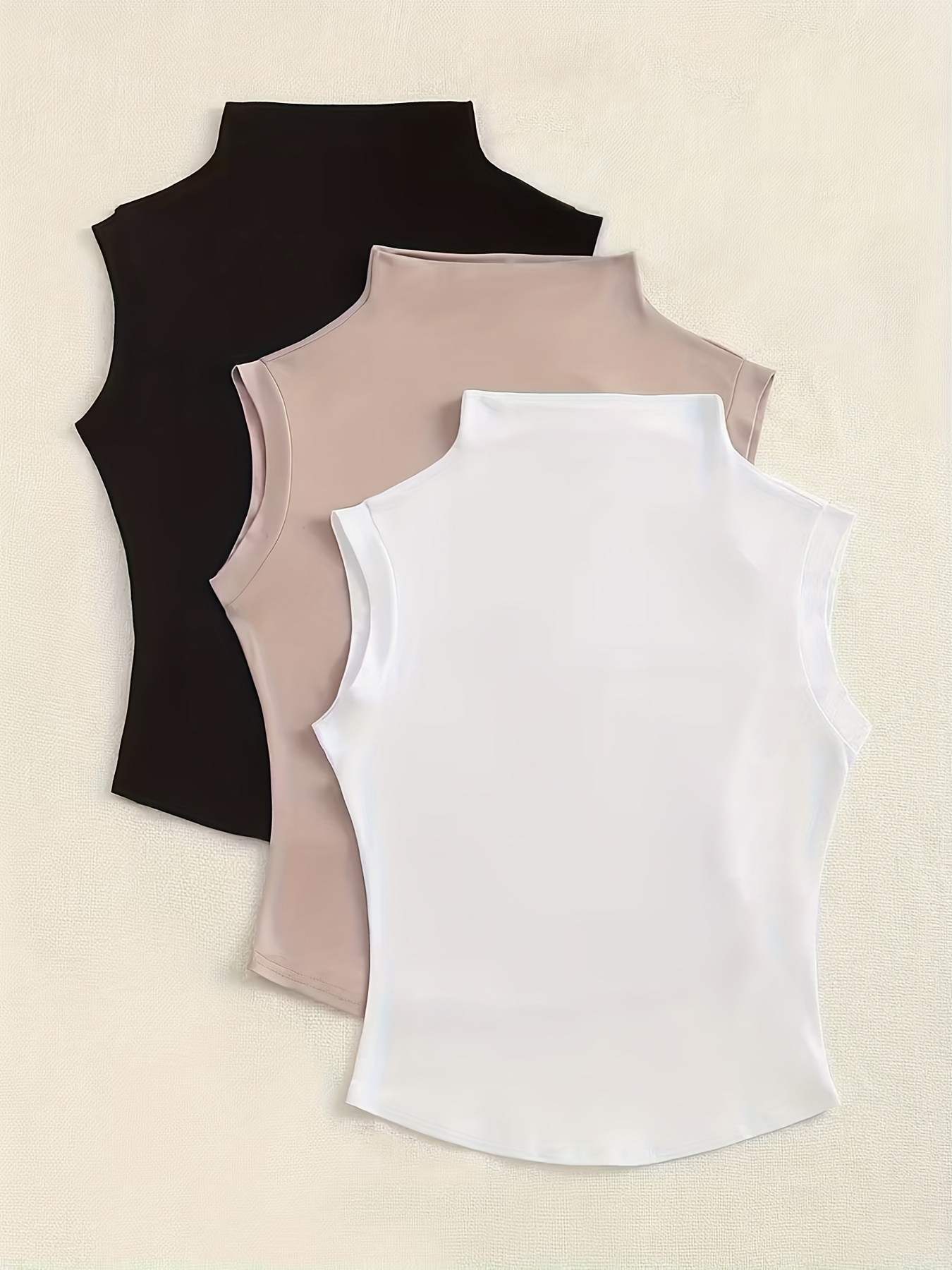Mujeres Moda Chic Casual Cuello Alto Ajustado Sin Mangas Tops Sólidos 3pcs