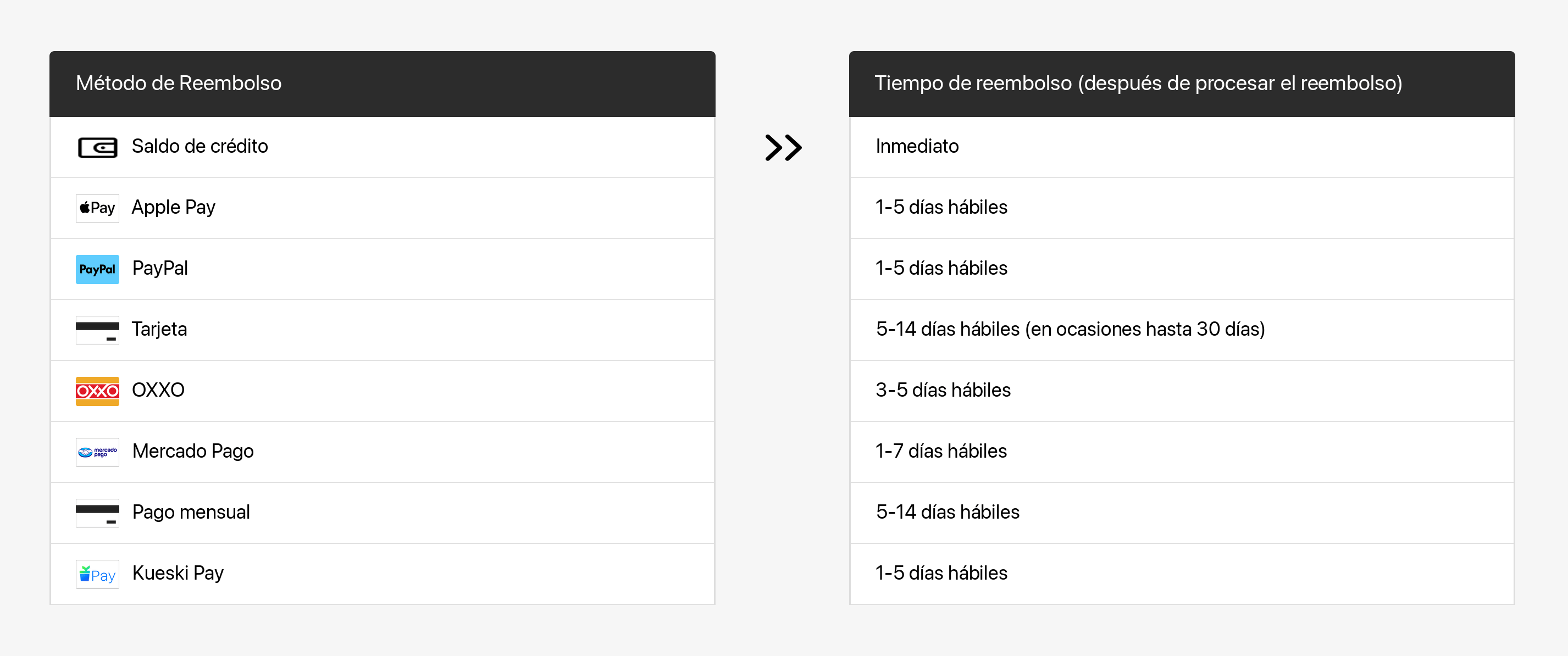 Una vez que se procese el reembolso, tu institución financiera necesitará tiempo adicional para que se refleje en tu cuenta. Consulta la siguiente tabla para obtener más detalles.