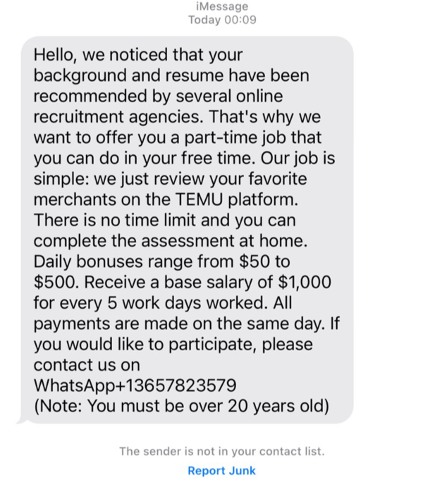 4. Je hebt berichten ontvangen van een onbekend nummer waarin financiële diensten of een parttime baan werden aangeboden, en je werd gevraagd om persoonsgegevens in te vullen (bijv. je Temu-accountgegevens of transactienummer).