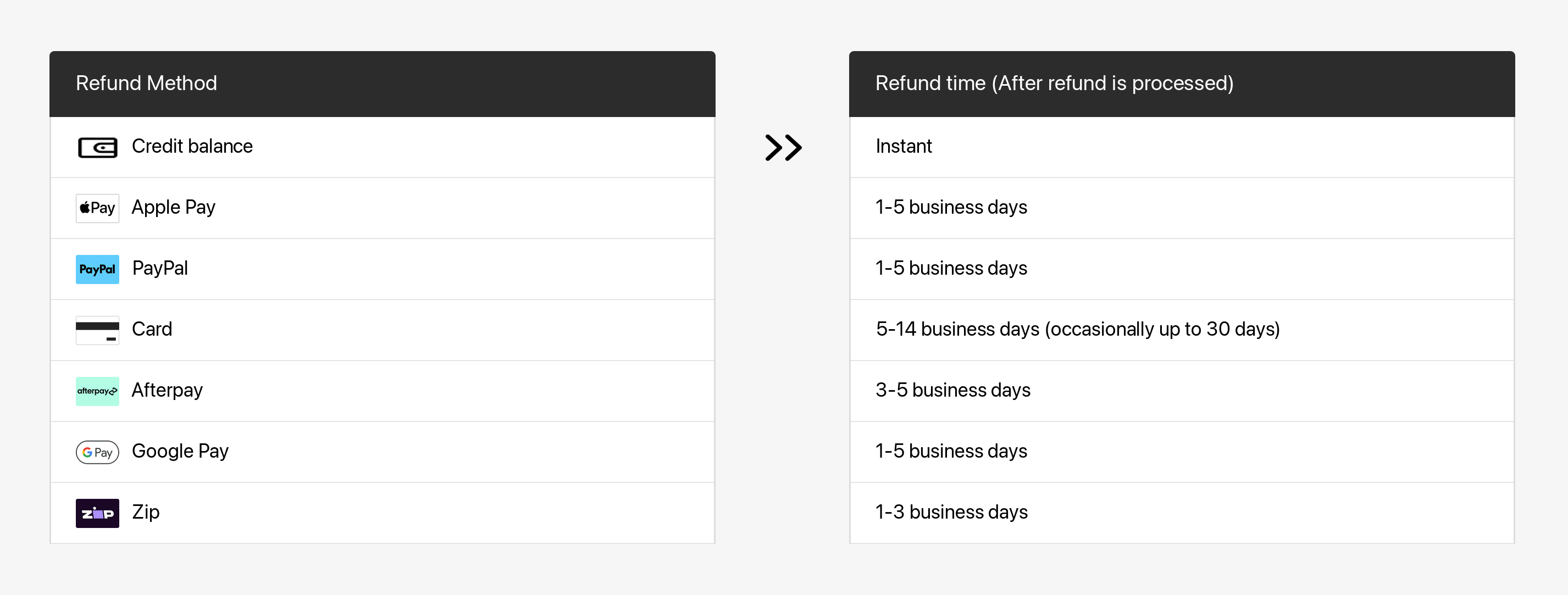 Once the refund is processed, your financial institution will need additional time to have it reflected in your account. Refer to the following table for more details.