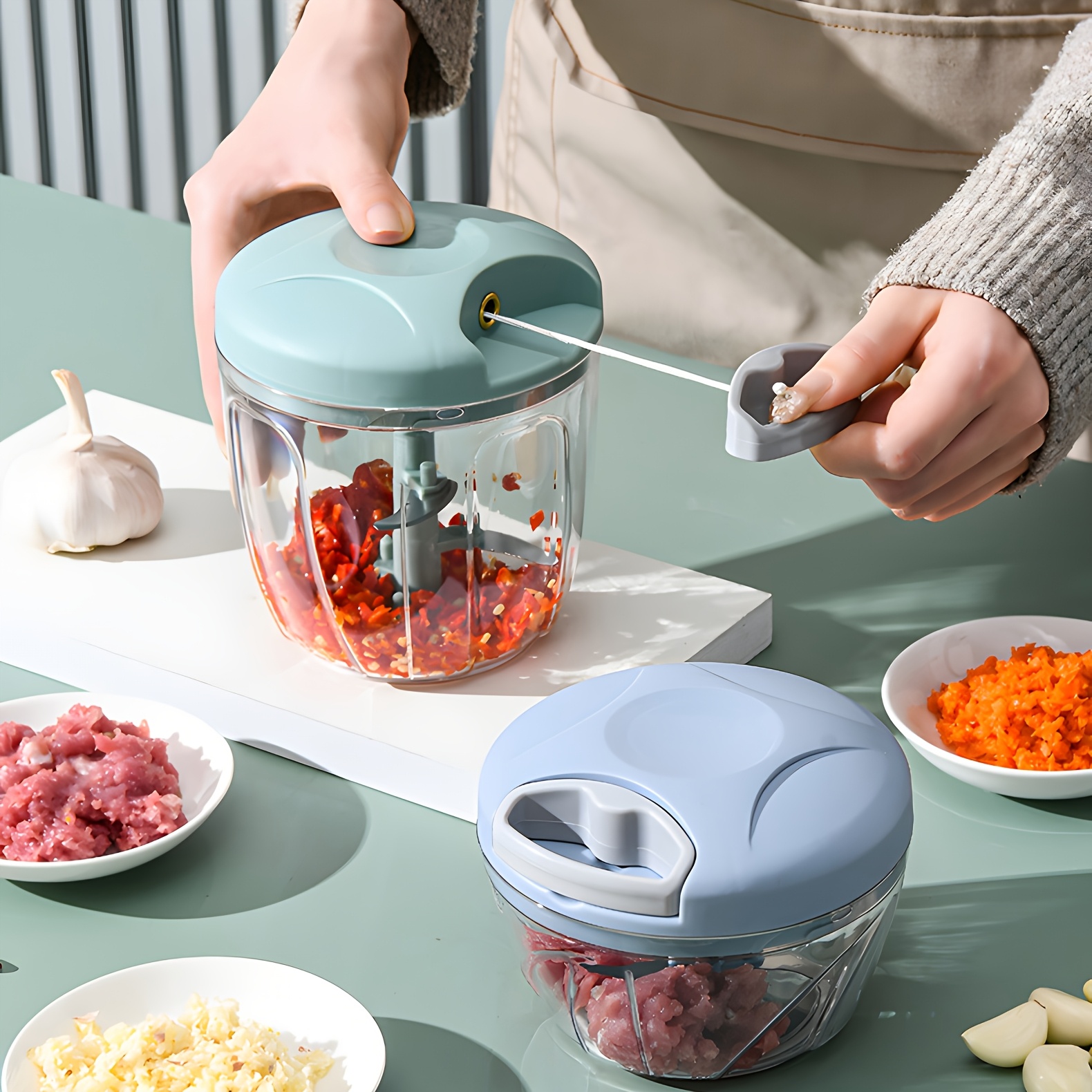Det kommer att spara mycket dyrbar tid och arbete: Fäst bladet i botten av skålen, lås locket, dra sedan i snöret, bladet kommer att vända sig, och då kan du få de hackade ingredienserna, vilket gör den tråkiga matberedningen mer intressant