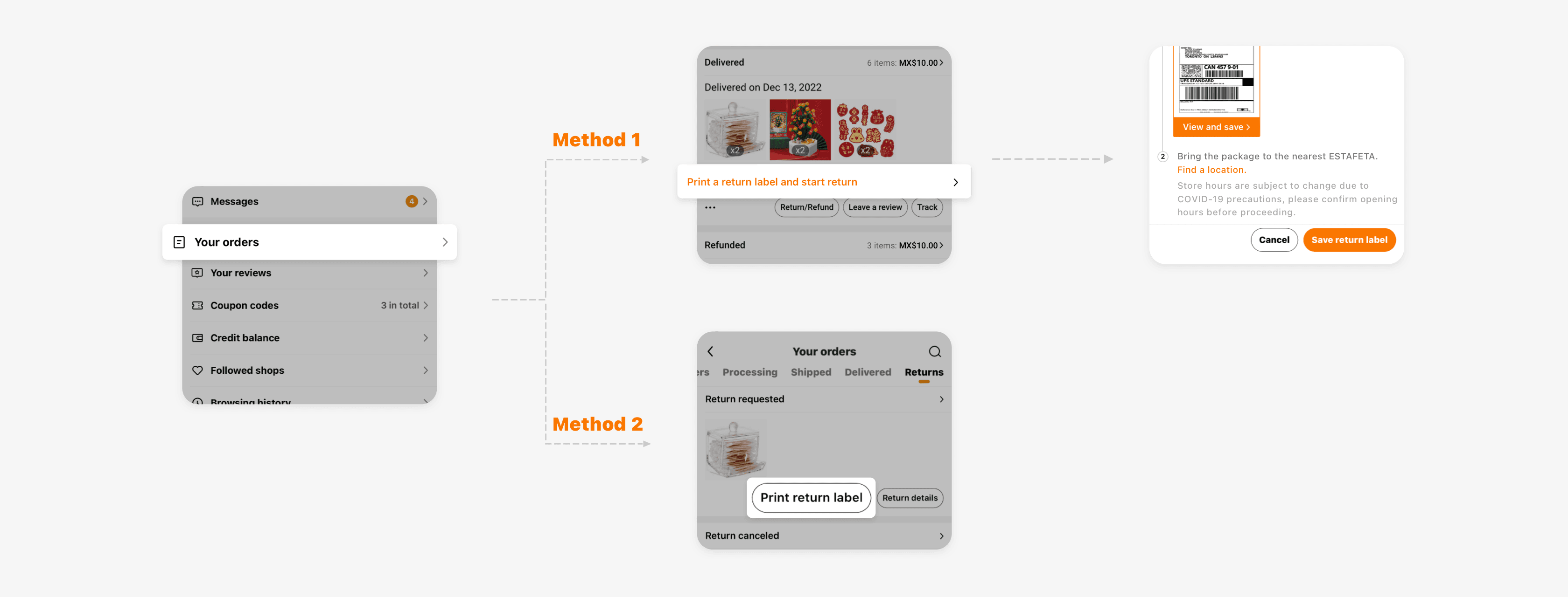 Puedes encontrar la etiqueta de devolución en dos sitios diferentes en "Tus pedidos"
