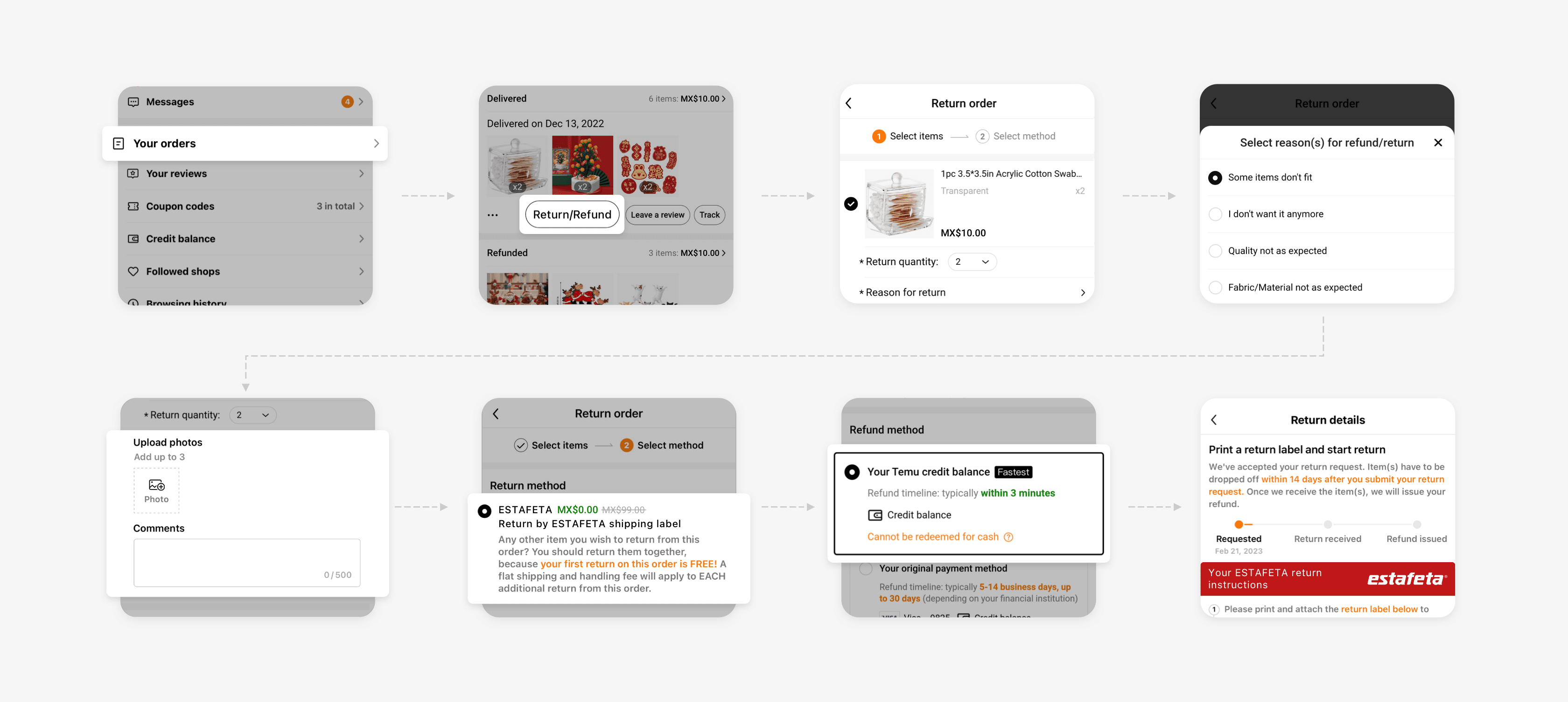 VIII. Puedes comprobar el estado del reembolso de tus artículos en la página de detalles del pedido o a través de las notificaciones por SMS/Email/Notificaciones de Temu.