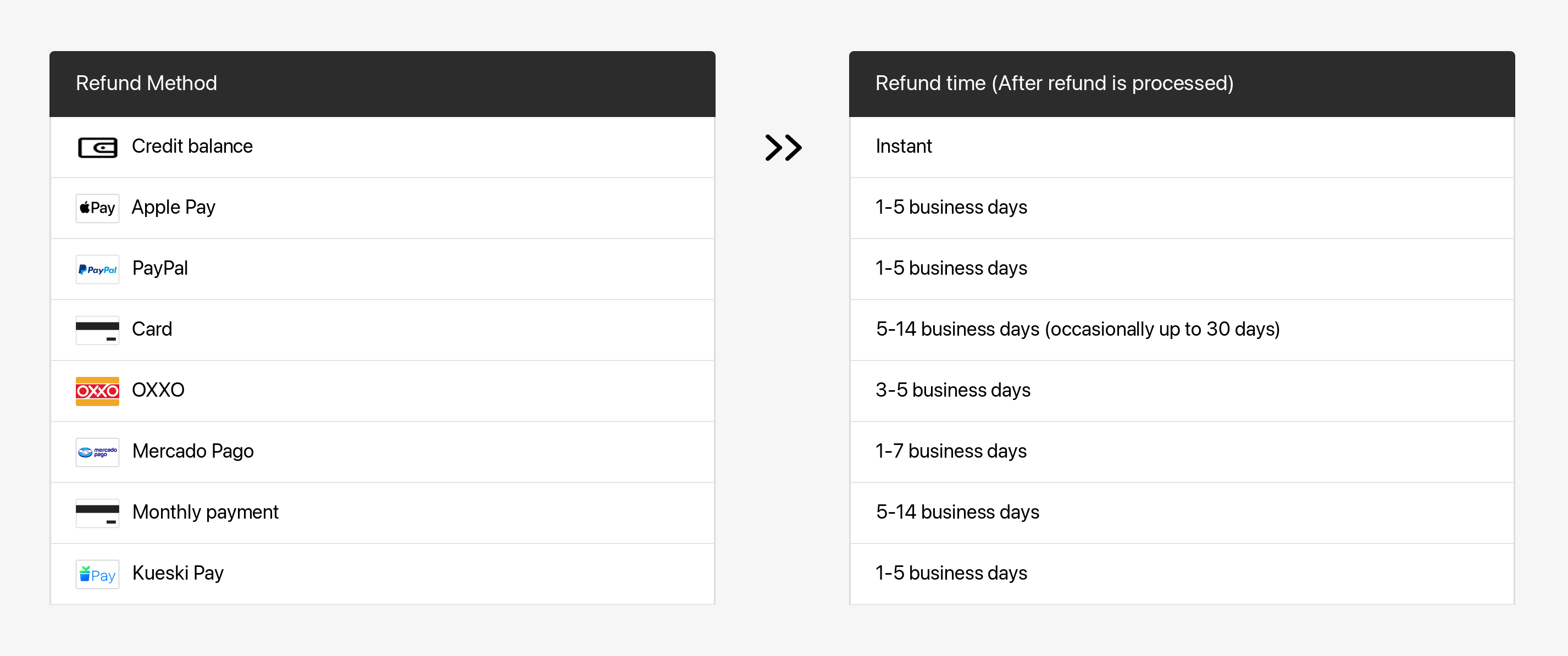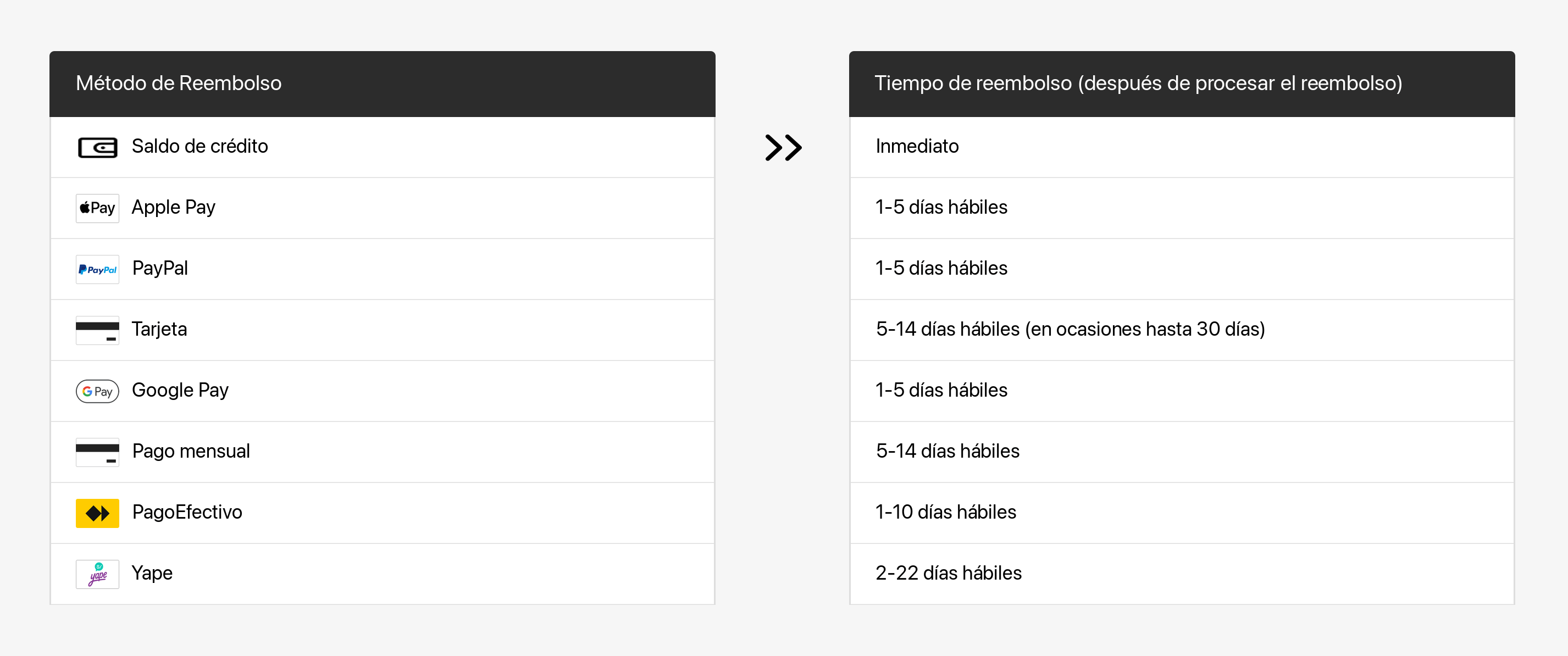 Una vez que se procese el reembolso, tu institución financiera necesitará tiempo adicional para que se refleje en tu cuenta. Consulta la siguiente tabla para obtener más detalles.
