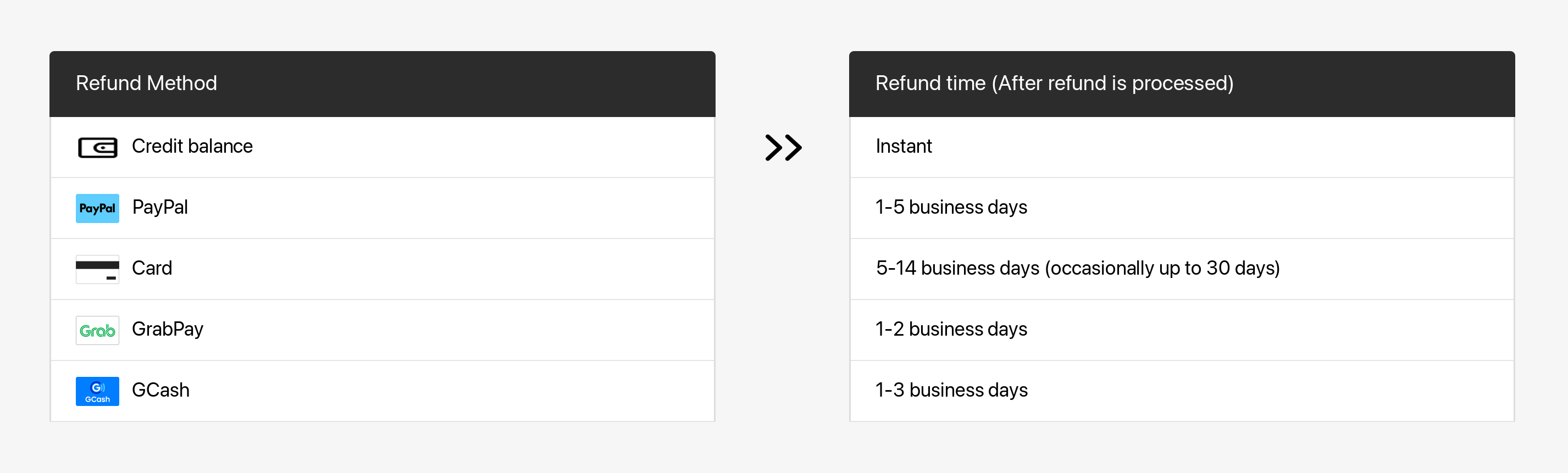 Once the refund is processed, your financial institution will need additional time to have it reflected in your account. Refer to the following table for more details.