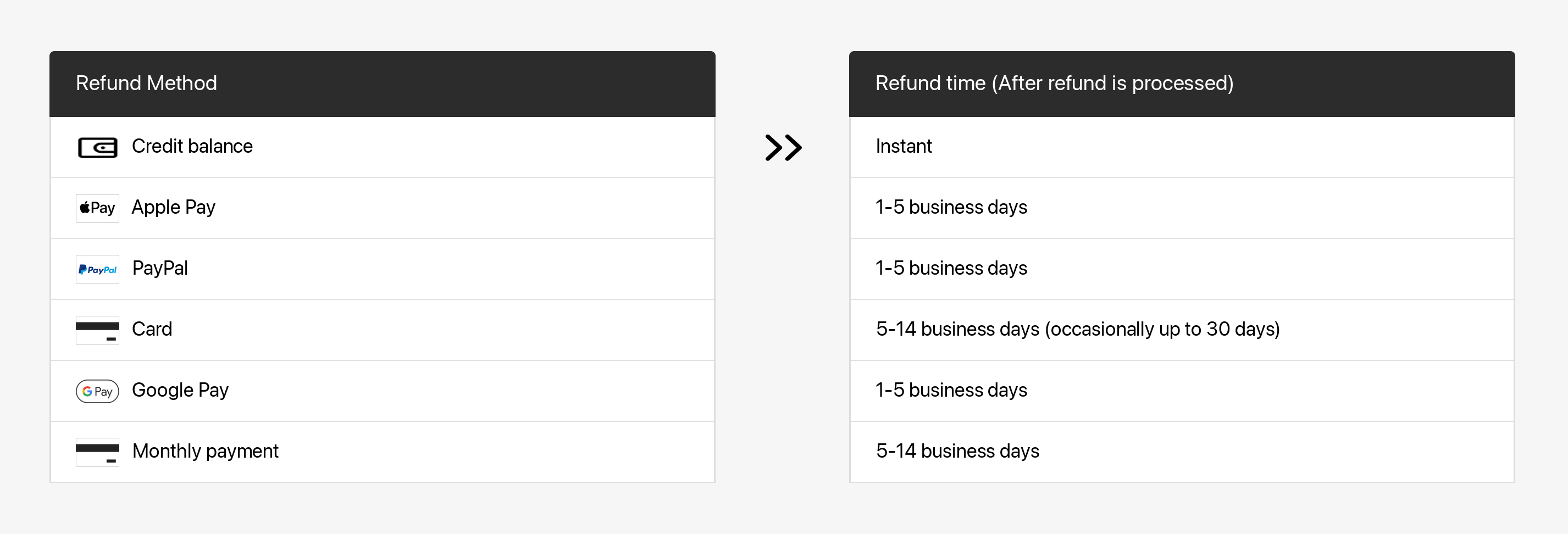 Once the refund is processed, your financial institution will need additional time to have it reflected in your account. Refer to the following table for more details.