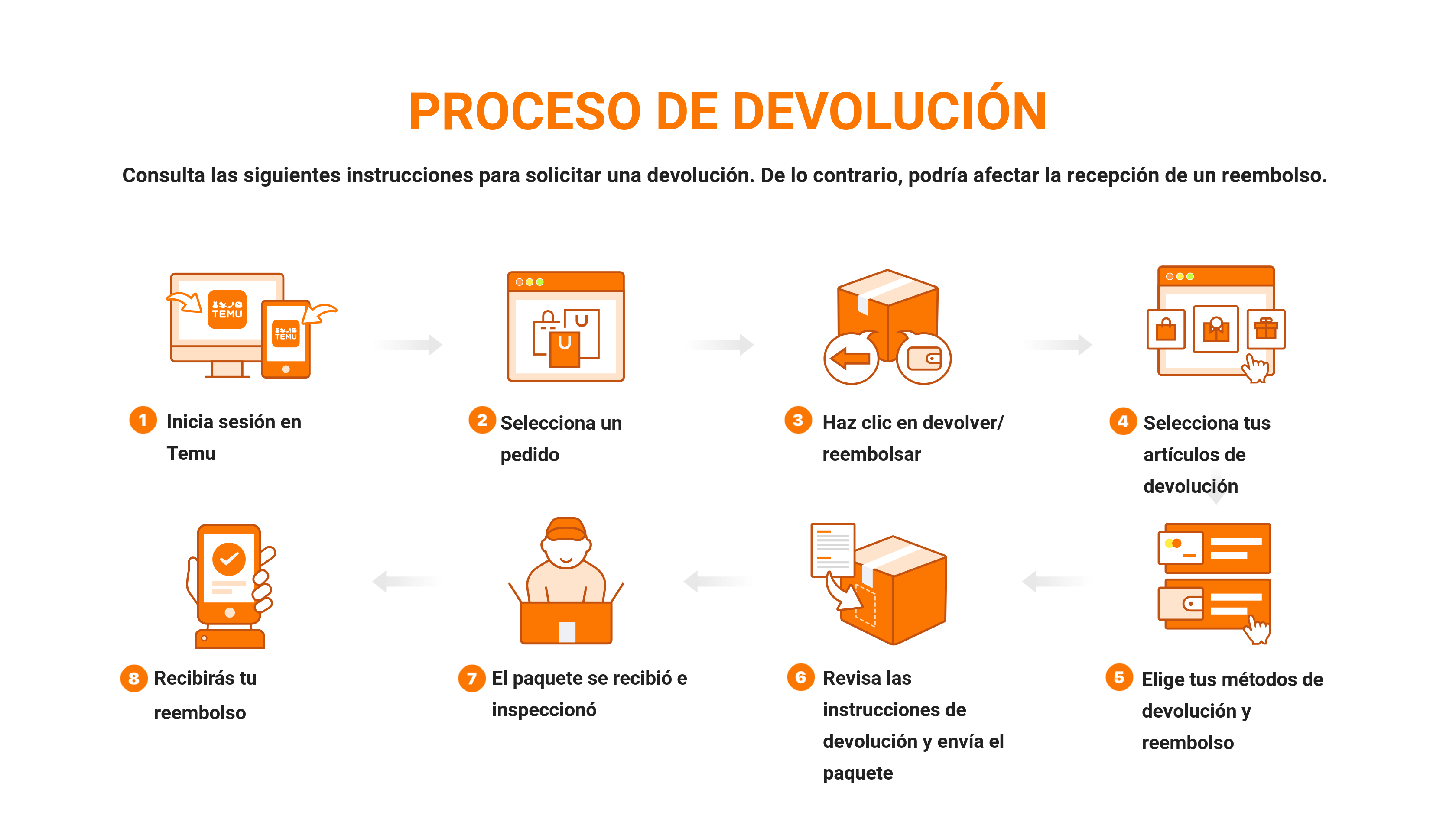 VIII. Puedes comprobar el estado del reembolso de tus artículos en la página de detalles del pedido o a través de las notificaciones por SMS/Email/Notificaciones de Temu.