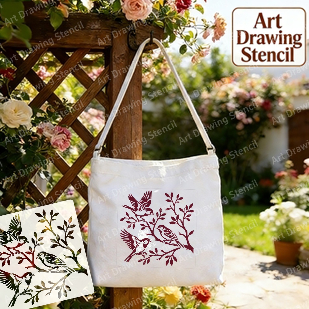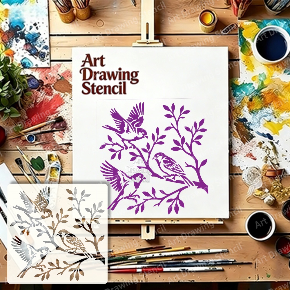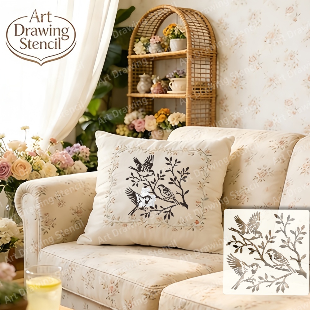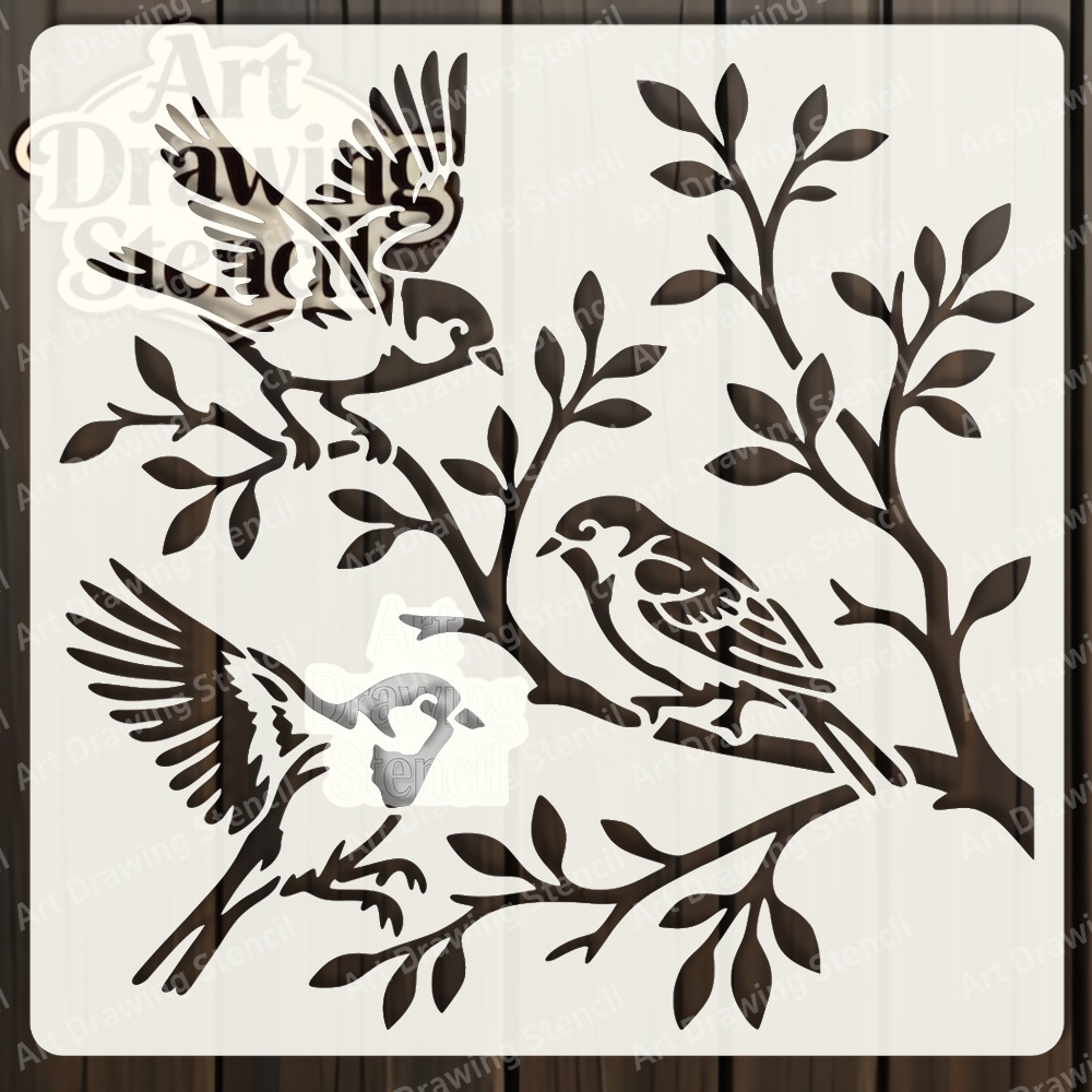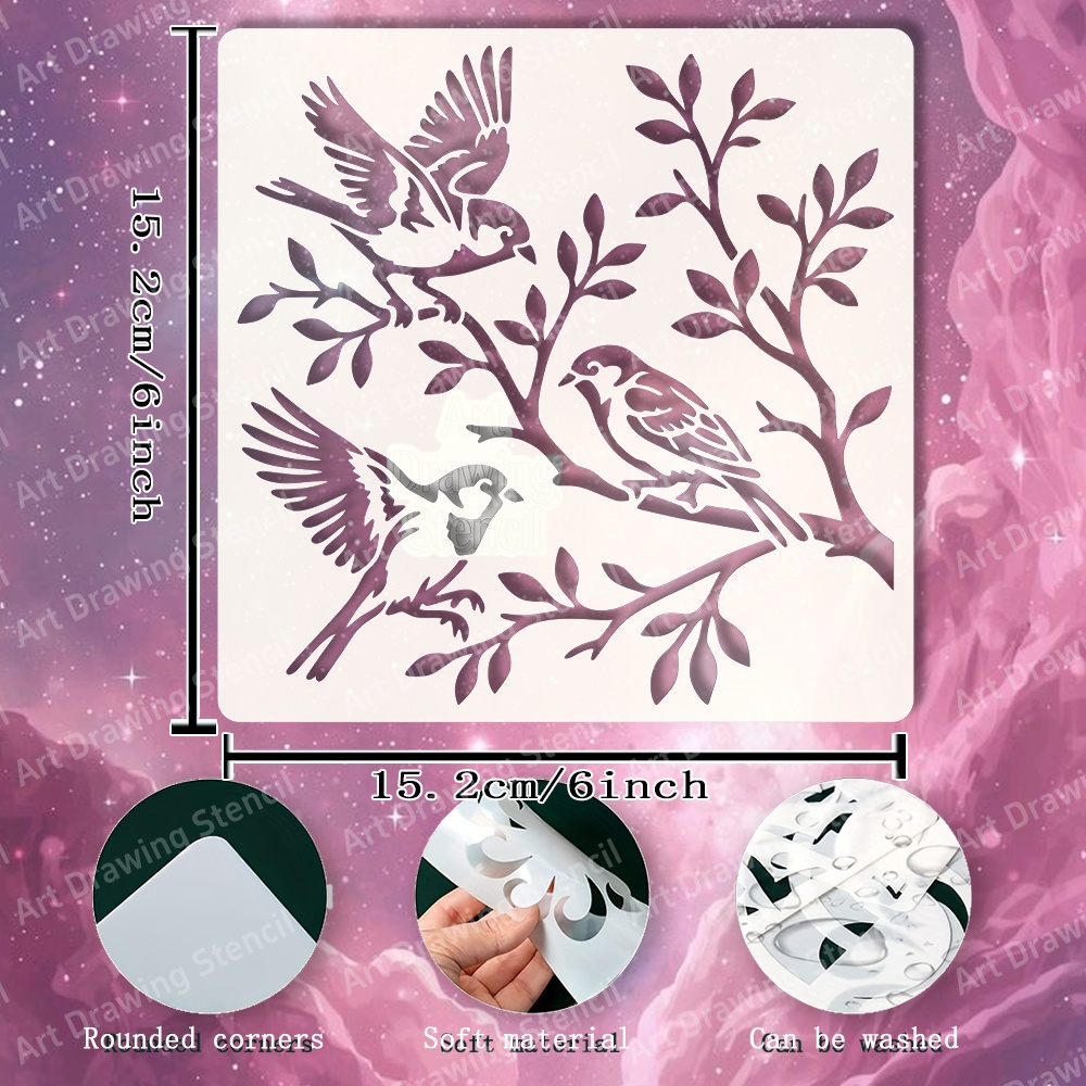 15.24X15.24 cm Nature Twig And Bird Silhouette Stencil | Reusable Painting Template With Detailed Feathers, Branches, And Leaves Pattern For Home Wall Decor, Scrapbooking, Card Making, Tote Bag, Fabric