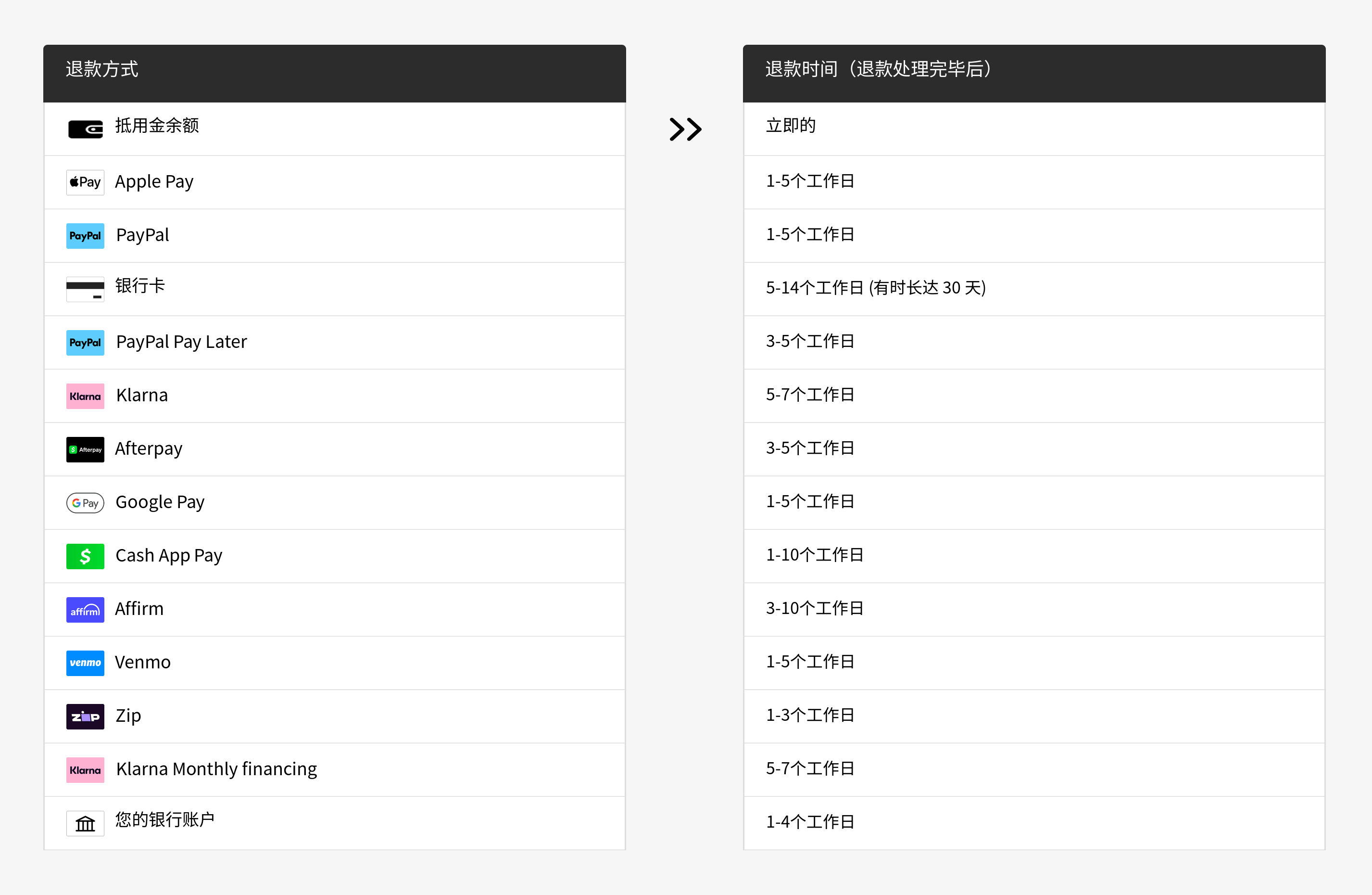 退款处理完毕后,您的金融机构将需要更多时间才能将其反映在您的帐户中。请参阅下表了解更多详细信息。