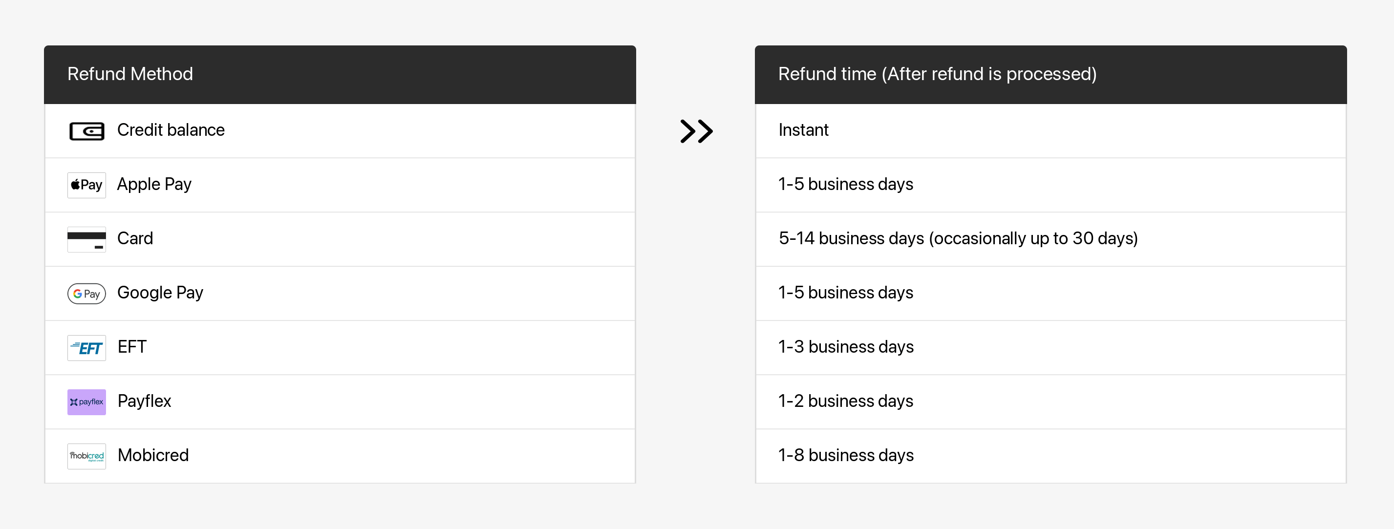 Once the refund is processed, your financial institution will need additional time to have it reflected in your account. Refer to the following table for more details.